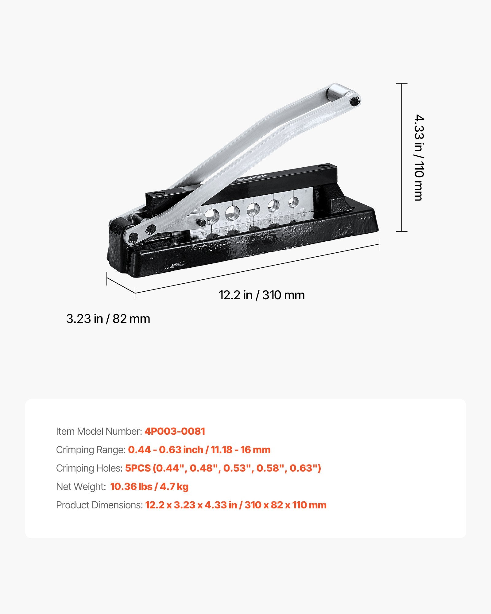 - Crimping Holes: 5PCS (0.44", 0.48", 0.53", 0.58", 0.63")