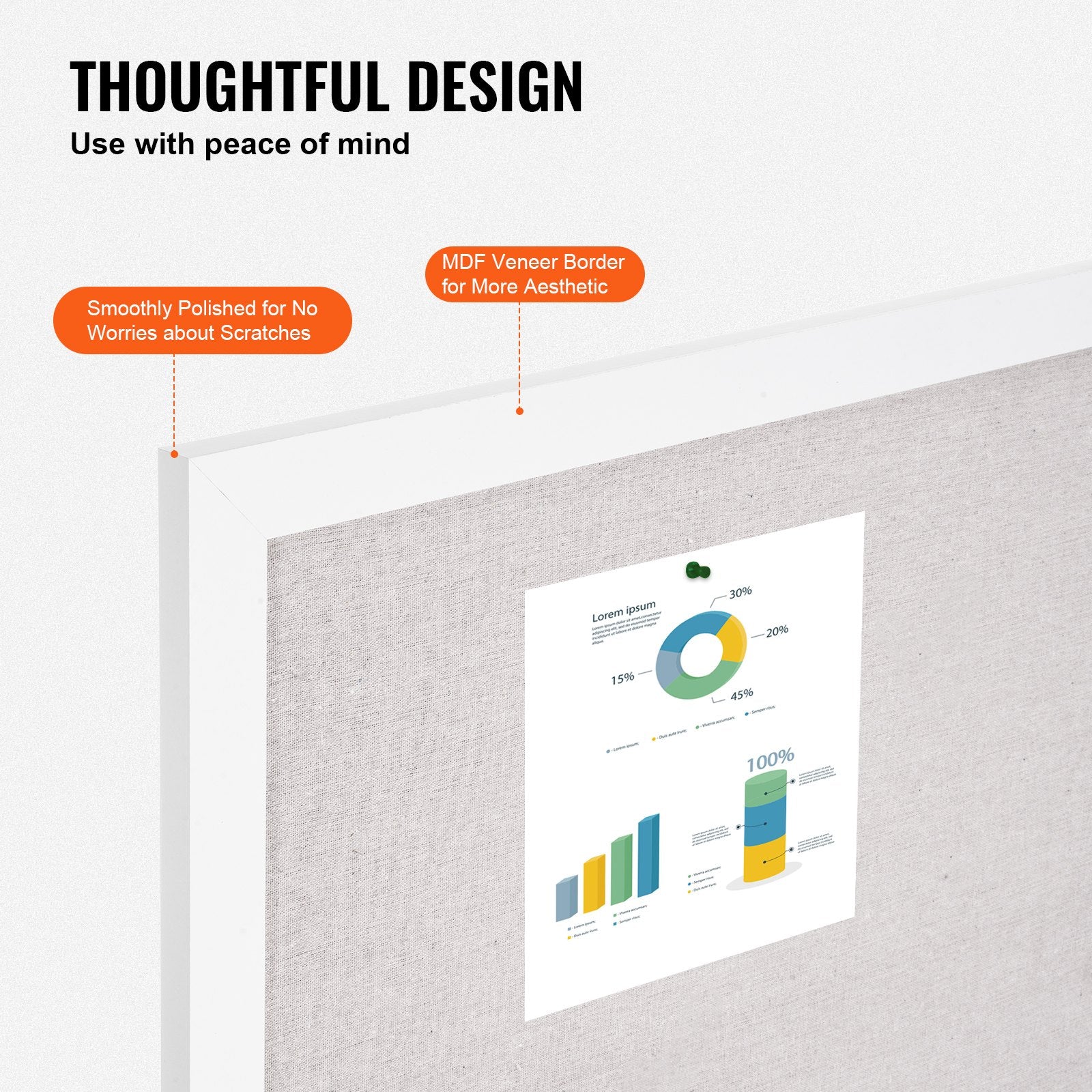 - Upgraded Linen Surface: Our notice board features a white polyester-cotton surface with a 7mm thick fiberboard core. It’s designed to resist unsightly pin holes even with long-term use. The surface is reinforced with glue and press plates, preventing bulging and ensuring secure and stable pinning.