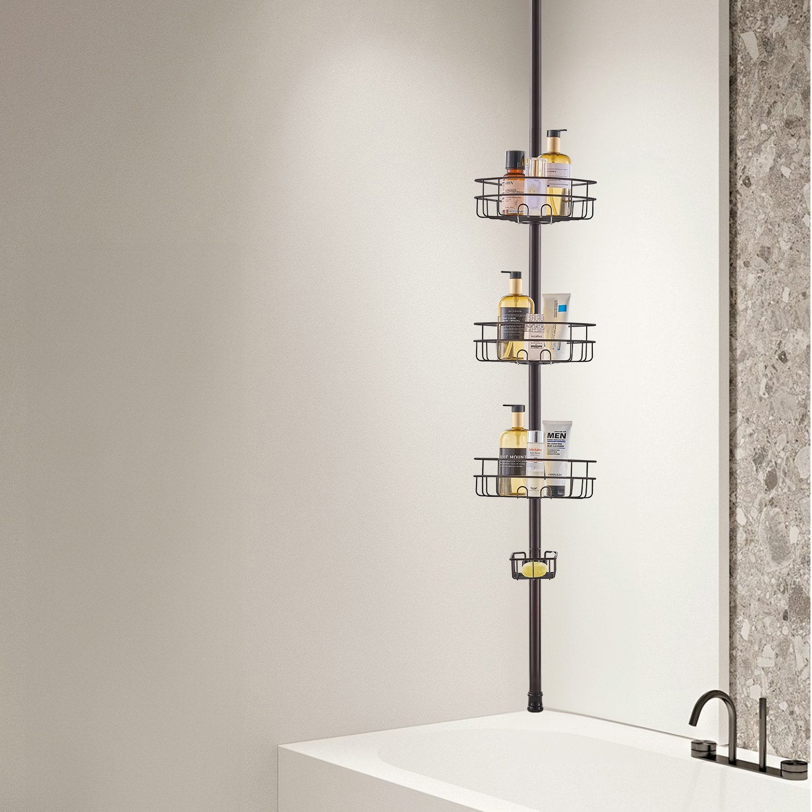 - Adjustable Height: The shower corner caddy tension pole is designed for bathrooms with different heights. It supports 39" to 125" range adjustment, easily adapts to a variety of installation environments, making storage more convenient. To ensure safety and stability, please do not install on the ceiling or slanted ceiling.