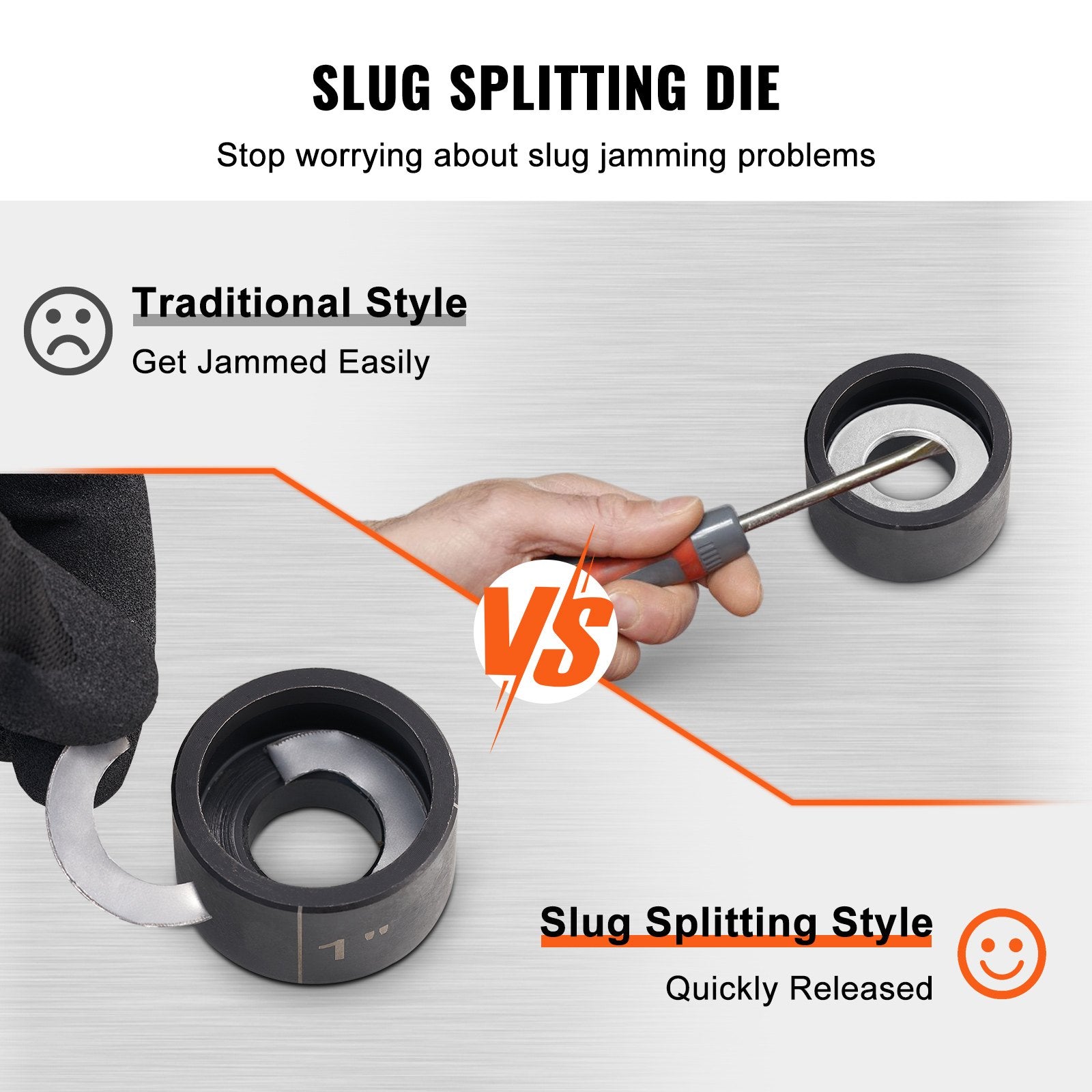 - Slug Splitting Designed: Punch easily and comfortably using our user-friendly knockout set! The innovative slug-splitting dies to make slug removal a breeze, leaving you with a clean and round hole every time. So you can get a reliable and seamless punching experience every time! It is also perfect for use in narrow places.