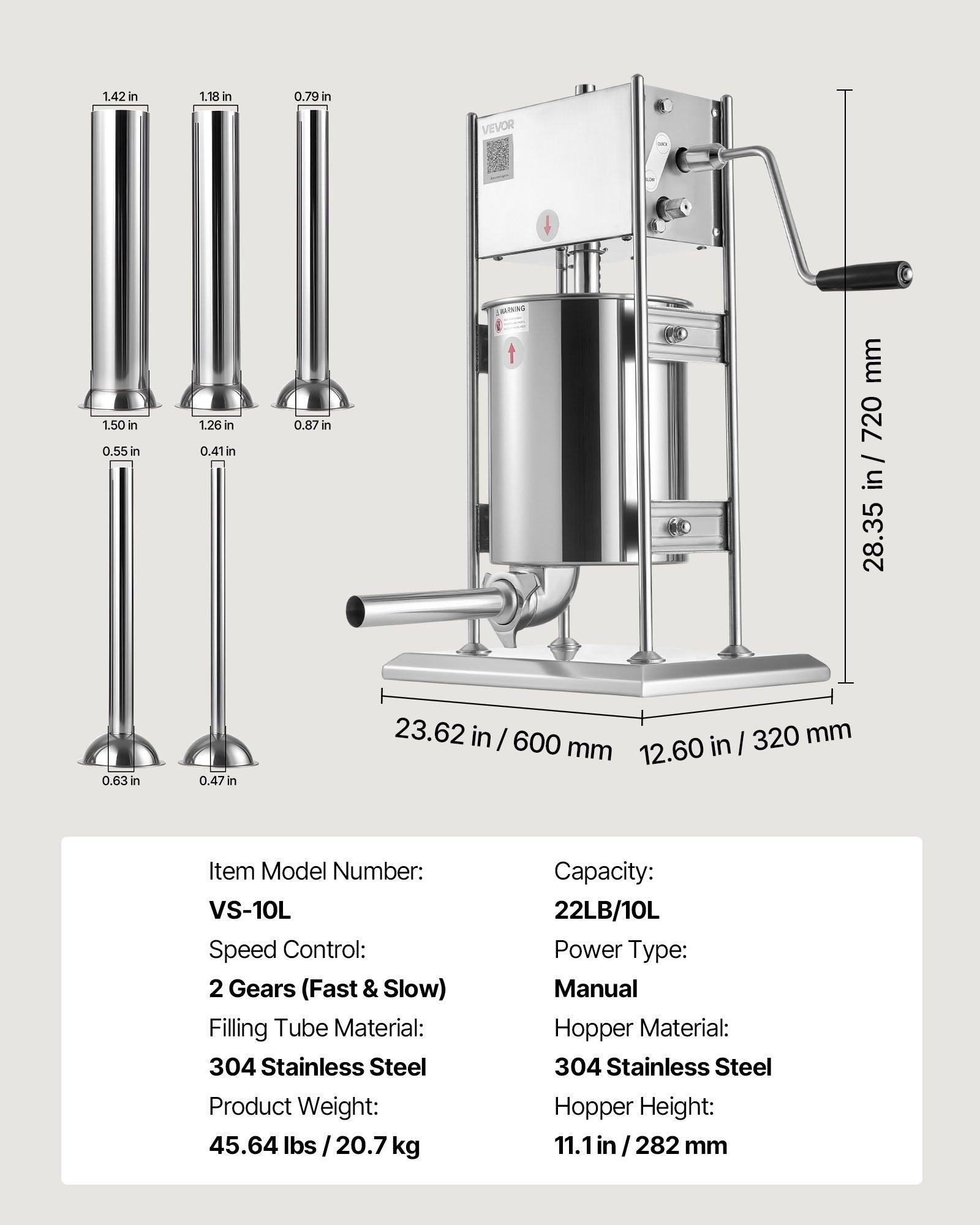 - Versatile Tubes: This vertical sausage filler includes five SUS 304 stuffing tubes: ⌀0.47(0.41) in, ⌀0.63(0.55) in, ⌀0.87(0.79) in, ⌀1.26(1.18) in, and ⌀1.50(1.42) in. All food-contact parts are burr-free and meet food-grade hygiene standards