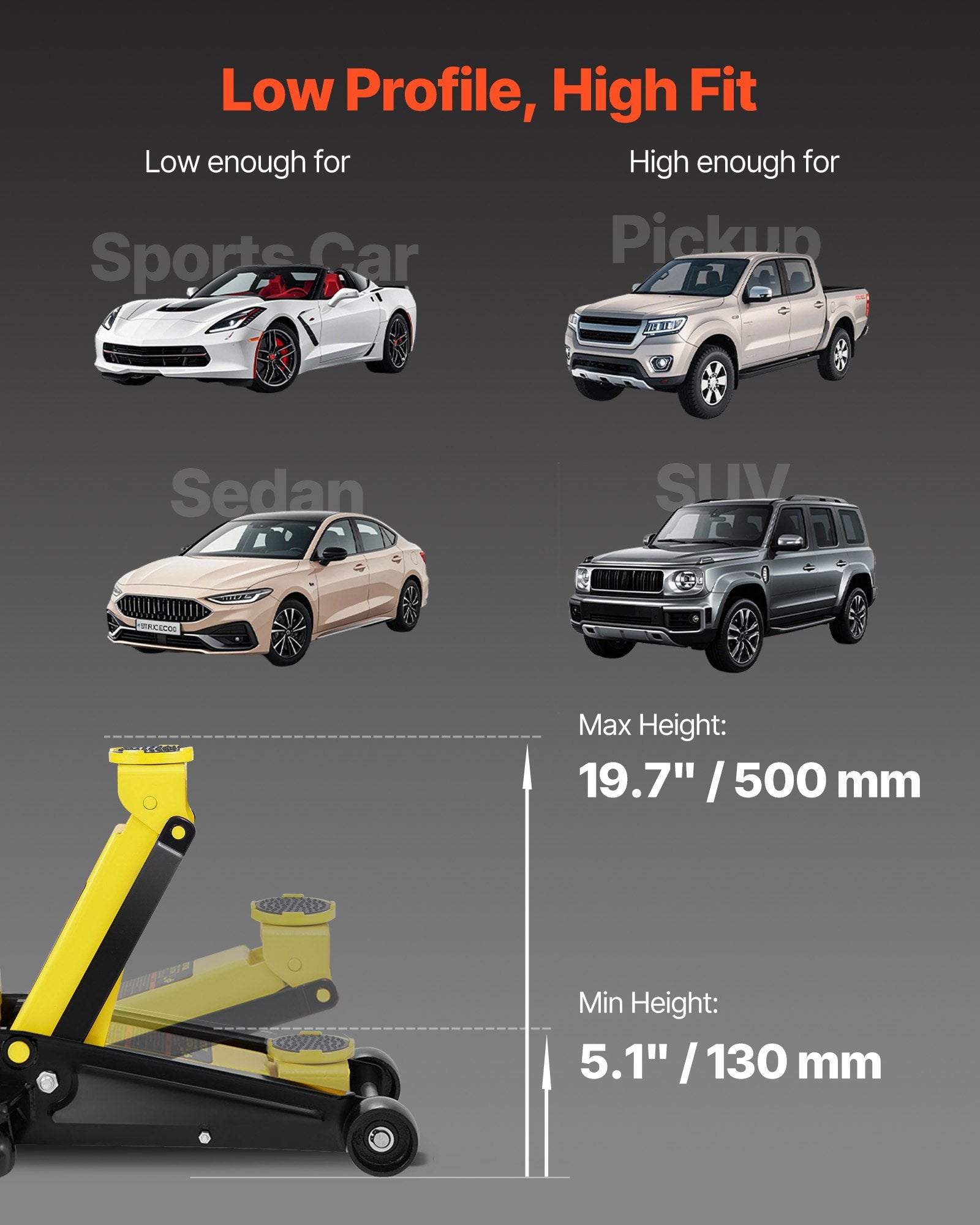 - For All Your Lifting Needs: Min. Height: 5.12"/130 mm. Max. Height:19.7"/500 mm. The wide lifting range meets your lifting needs of family cars, trucks, SUVs, etc. And a single piston quick hydraulic pump allows you to pump the jack to the desired height easily.