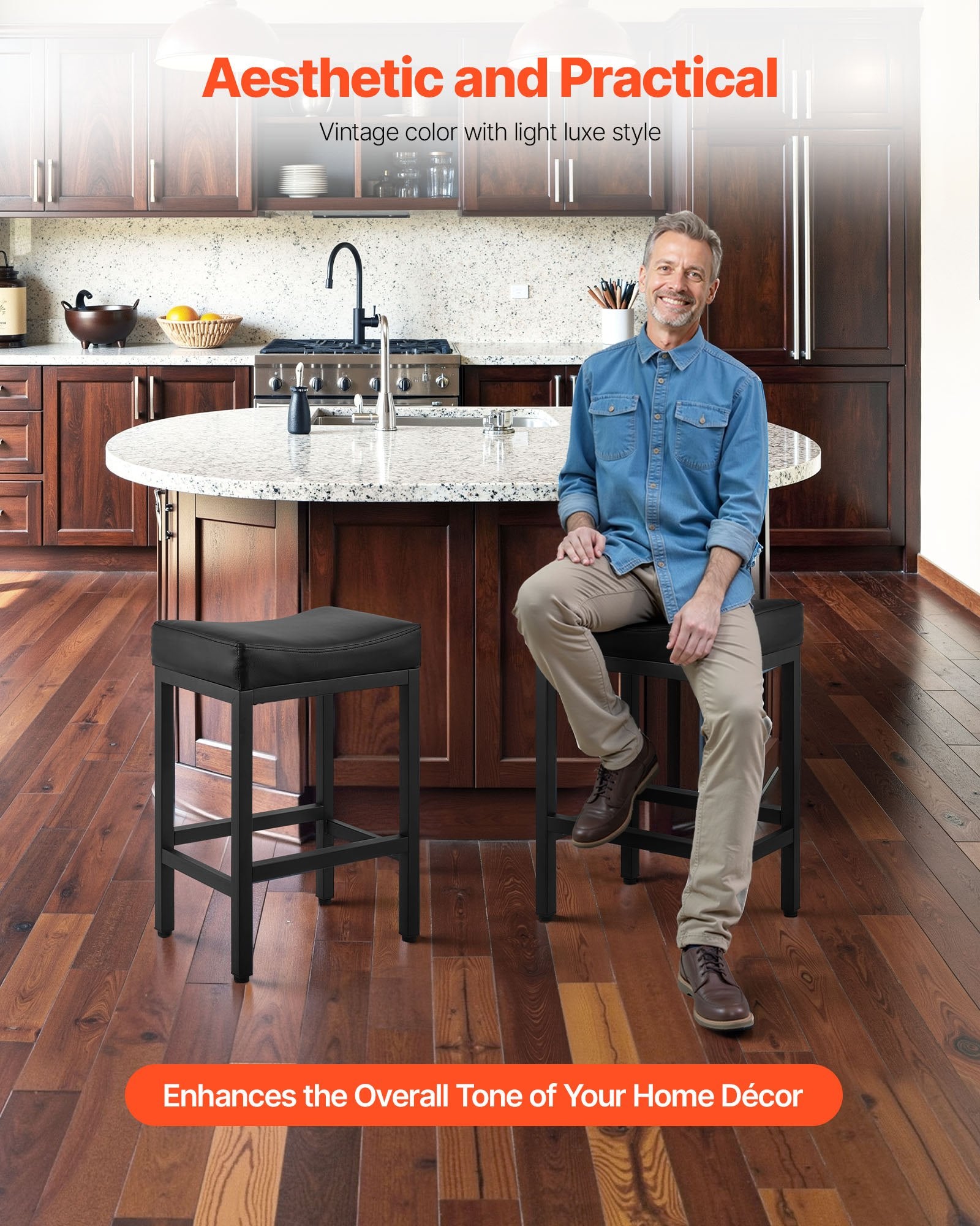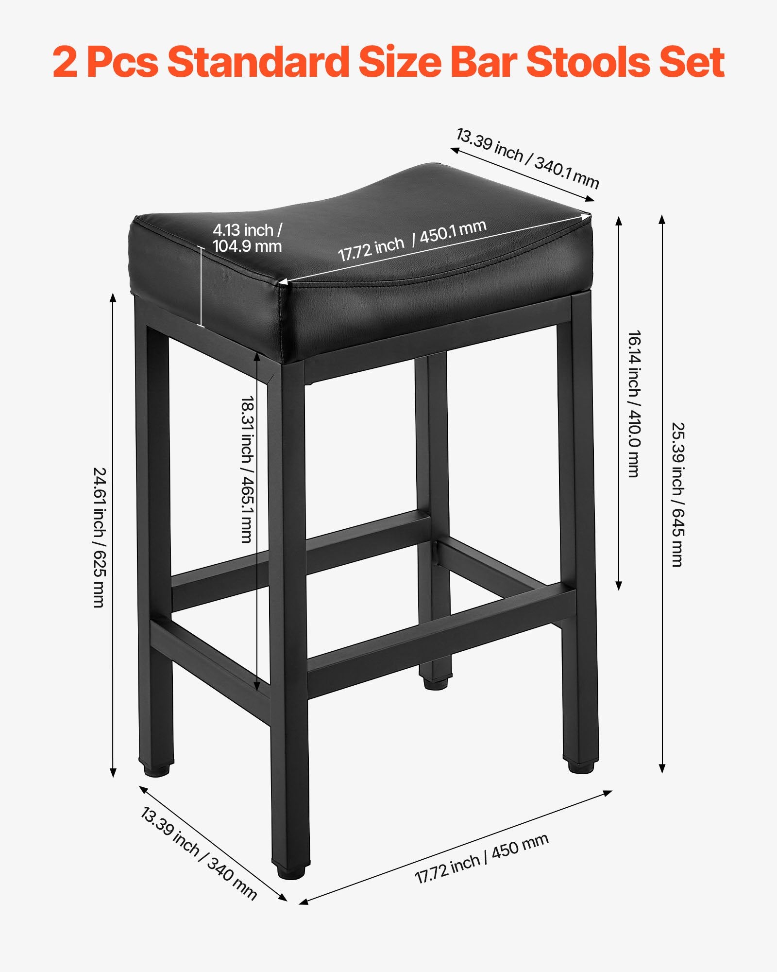 Bar Stool Set of 2, PU Leather Counter Height Stools, 25 inch Barstool with Saddle-Seat and Metal Legs, Easy Assembly Backless Bar Chair, Island Barstools for Kitchen, Dining Room, Cafe, Black