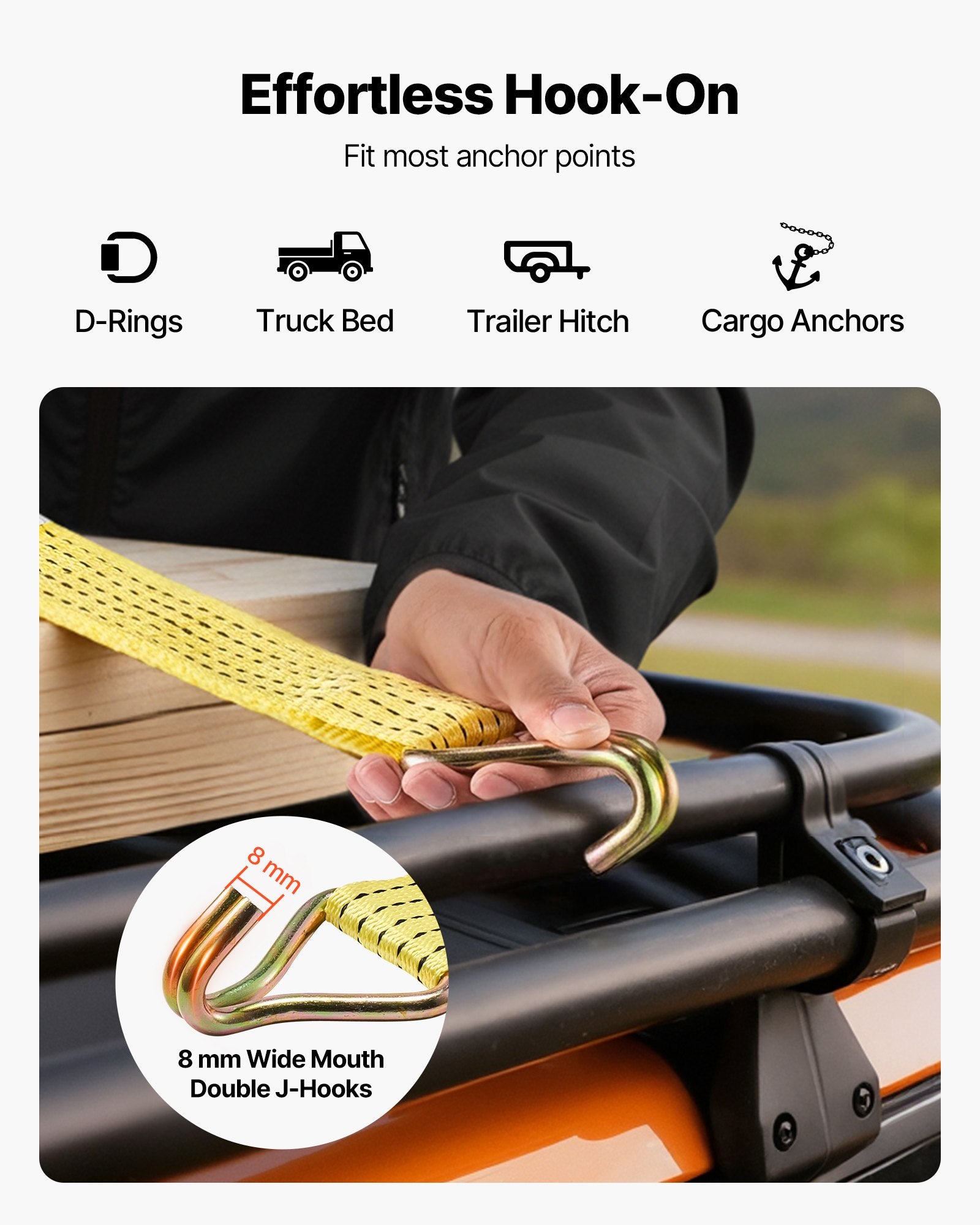 - Quick-Clip Ready: The wide-mouth double J-hooks latch quickly to truck rails, trailer tie-downs, and D-rings. The ratchet tie down strap tightens smoothly to keep cargo snug for furniture moves, outdoor gear, and equipment