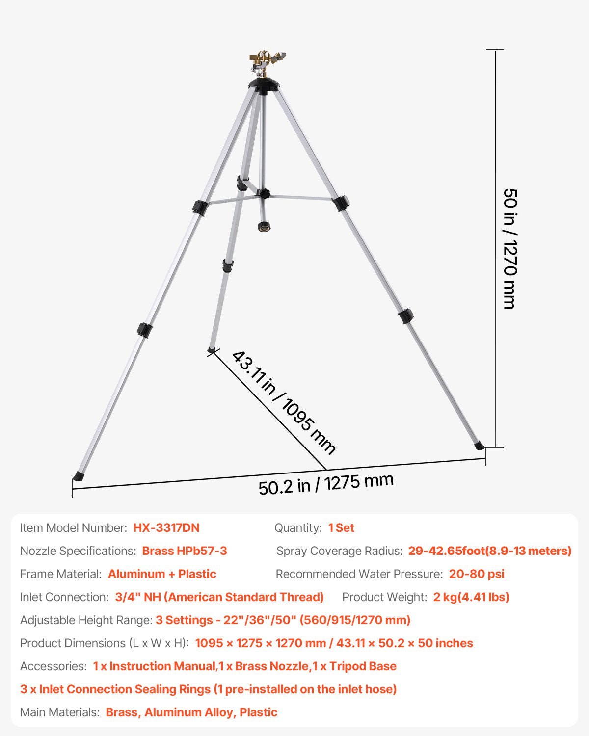 - Three-Level Adjustable Height: The tripod stand offers three adjustable heights: 22/36/50 in (560/915/1270 mm). The stand features quick-lock leg adjustments to accommodate different irrigation heights, avoiding obstruction by shrubs or other obstacles.