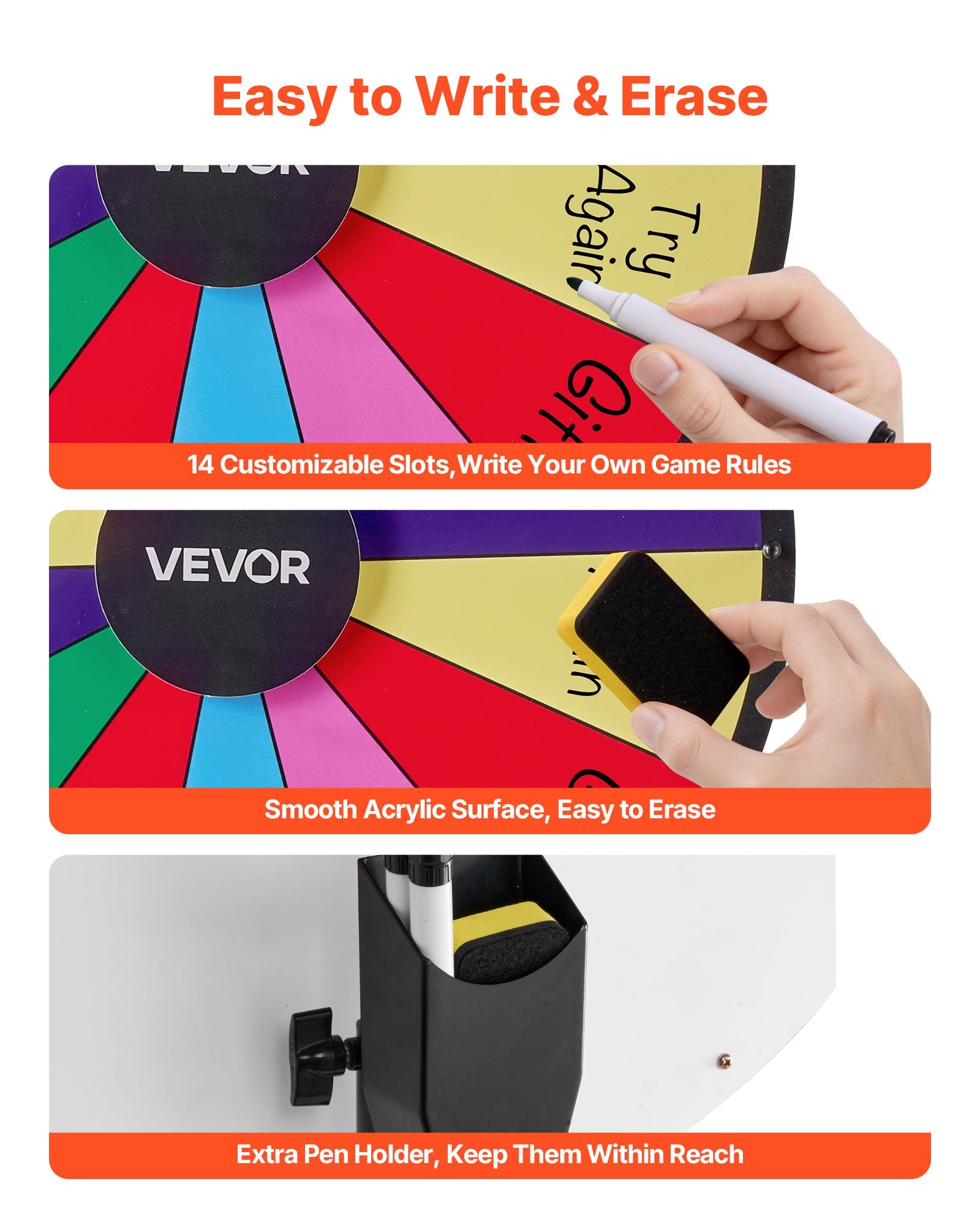 - Customizable & Editable: 14 slots to personalize your games. Smooth, rewritable board with vibrant colors makes your prize wheel stand out at any event