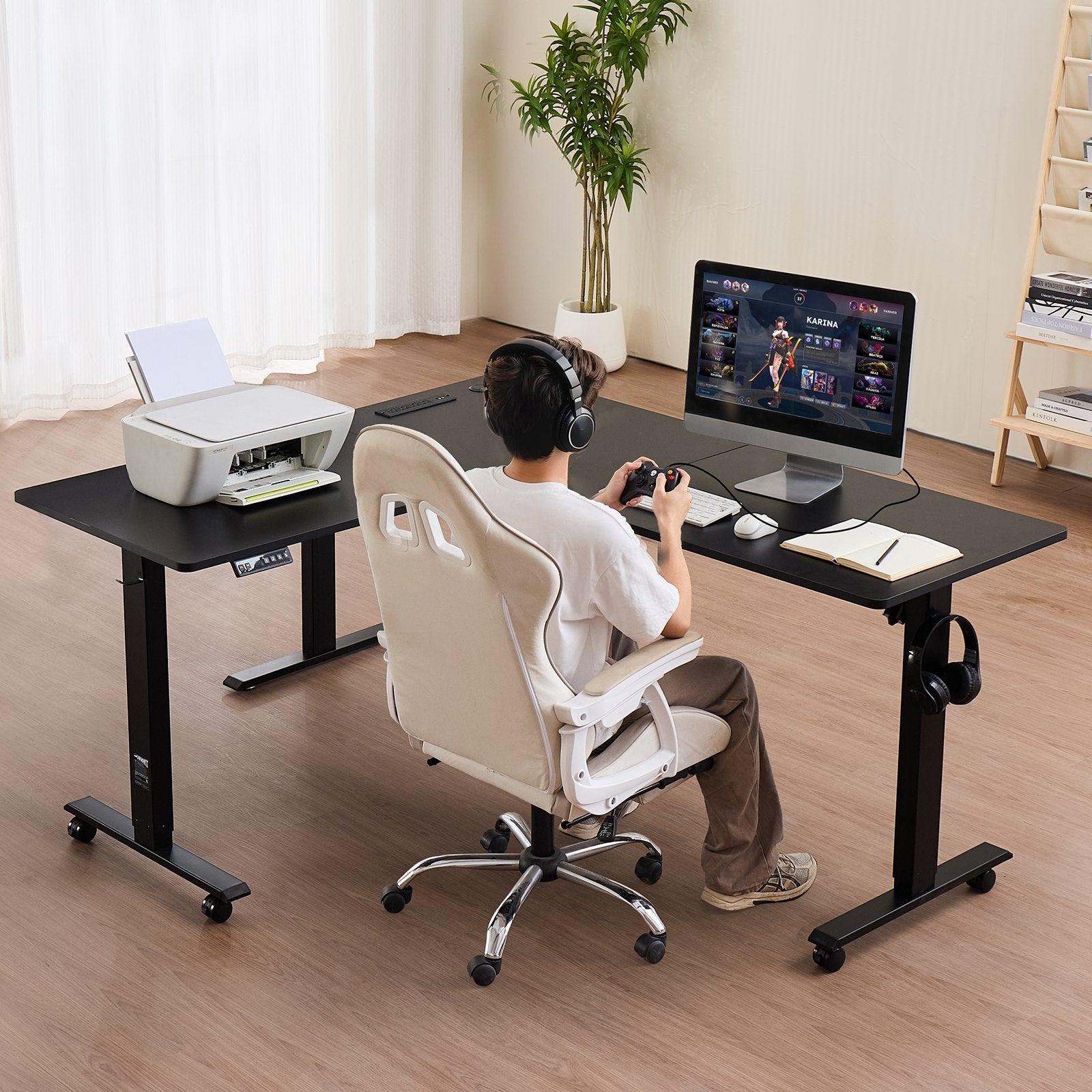 - Spacious Workspace: The 63 x 55.2 in / 160 x 140.2 cm L-shaped adjustable height desk provides ample space, making it ideal for home offices and gaming. The large surface easily accommodates 3 monitors, 2 laptops, and other office accessories