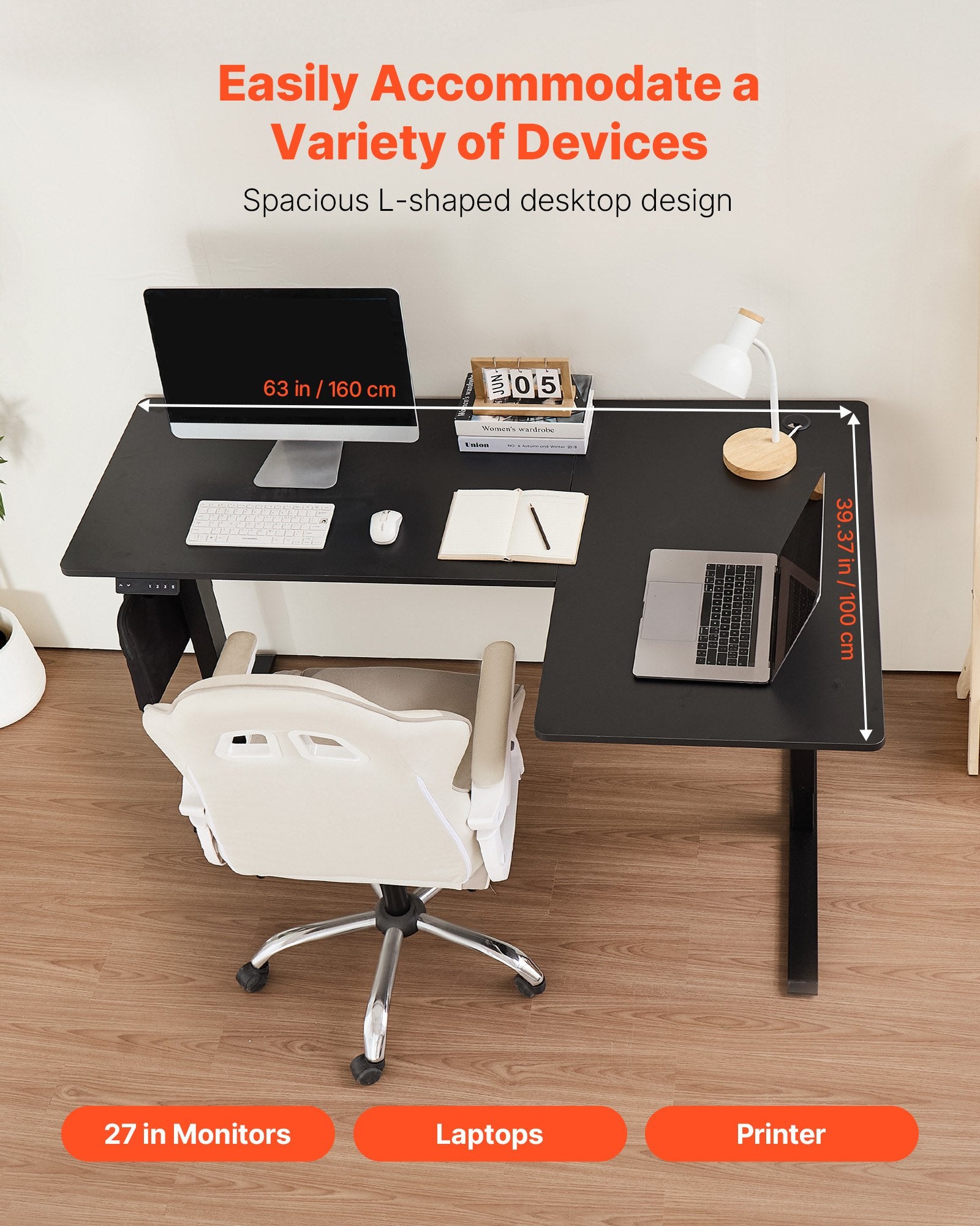 L Shaped Desk, Electric Adjustable Height Corner Gaming Desk with Dual Hooks, Heavy Duty Carbon Steel L-Shaped Computer Table with Power Strip for Home, Office, Dorm, Easy to Assemble, Black