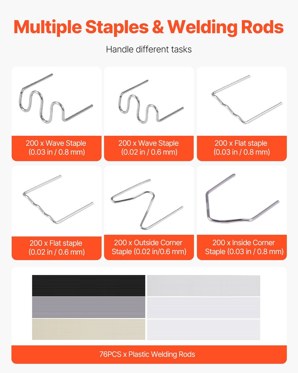- Wide Applications: Designed specifically for cars, kayaks, plastic furniture, and toys, this hot staple welding gun includes 1200PCS 6 types of hot staples and 76 welding rods (20 black multi-functional rods and 56 welding rods of 7 different materials: ABS, PP, PE, TPE, PC, PUR, and PA) to meet various plastic welding needs.