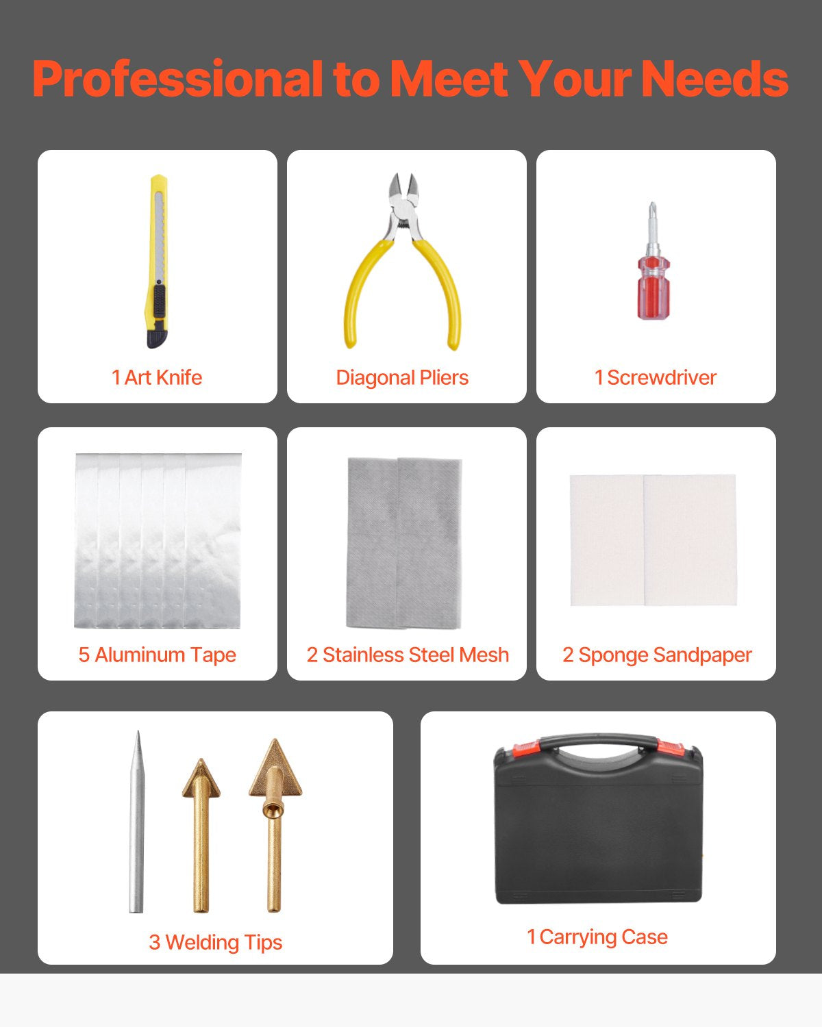- Professional Plastic Welding Kit: This plastic welder tool kit includes 1000pcs 5 types of hot staples, 60 welding rods, 3 welding tips (welding boot tip, triangular copper tip, soldering iron tip), 1 art knife, 1 diagonal pliers, 1 screwdriver, 2 stainless steel meshes, 2 sponge sandpapers, 5 aluminum tapes, and 1 carrying case, providing complete accessories for both beginners and pros.