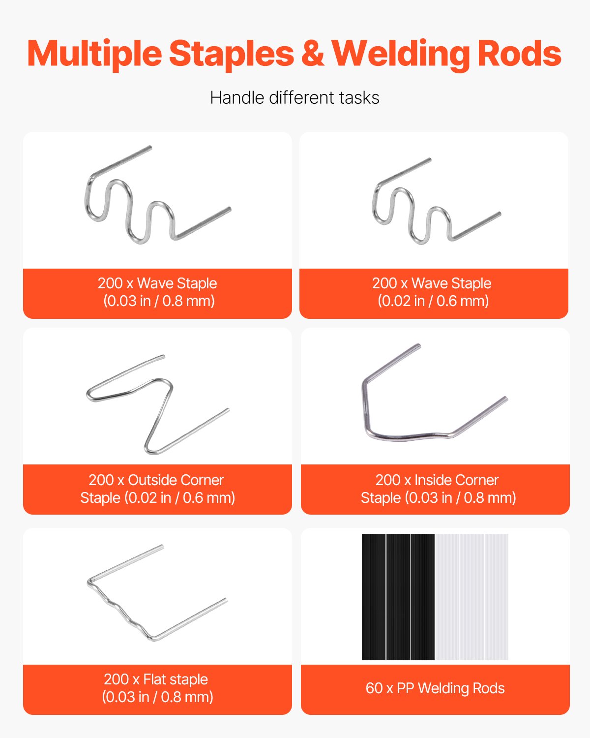 - Wide Applications: Our plastic repair welding kit includes 30 black and 30 white PP plastic welding rods, along with 1000 tungsten alloy staples. This versatile kit is perfect for repairing car bumpers, dashboards, lamp bases, plastic rings, motorcycles, and daily plastic items.