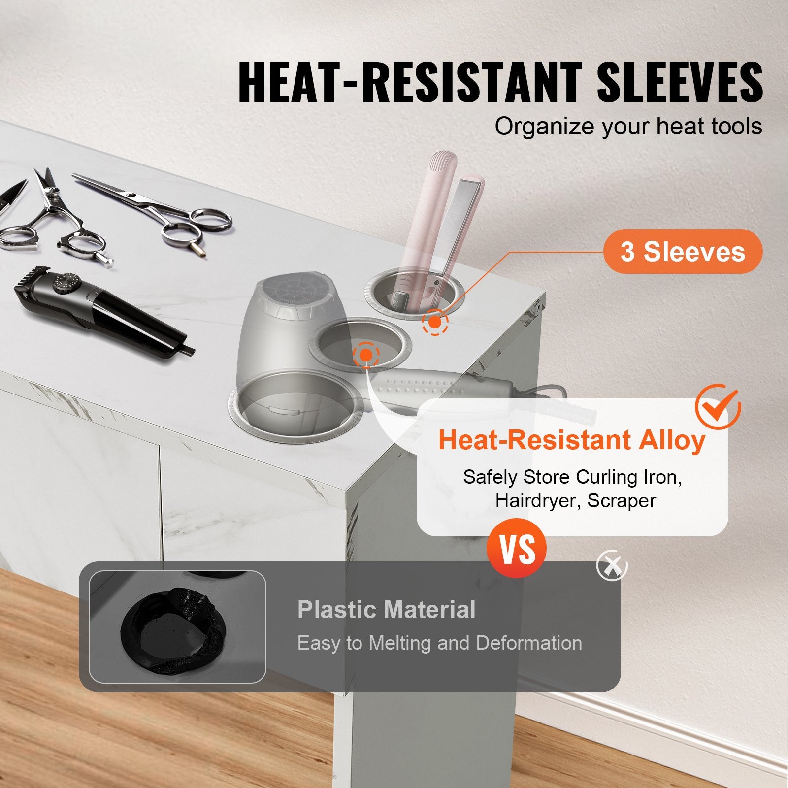 - Heat-Resistant Tool Sleeves: Made of heat-resistant alloy material, the hair styling salon station provides three heat tool sleeves with a bottom cover design to prevent tools from falling, ensuring safety during use.