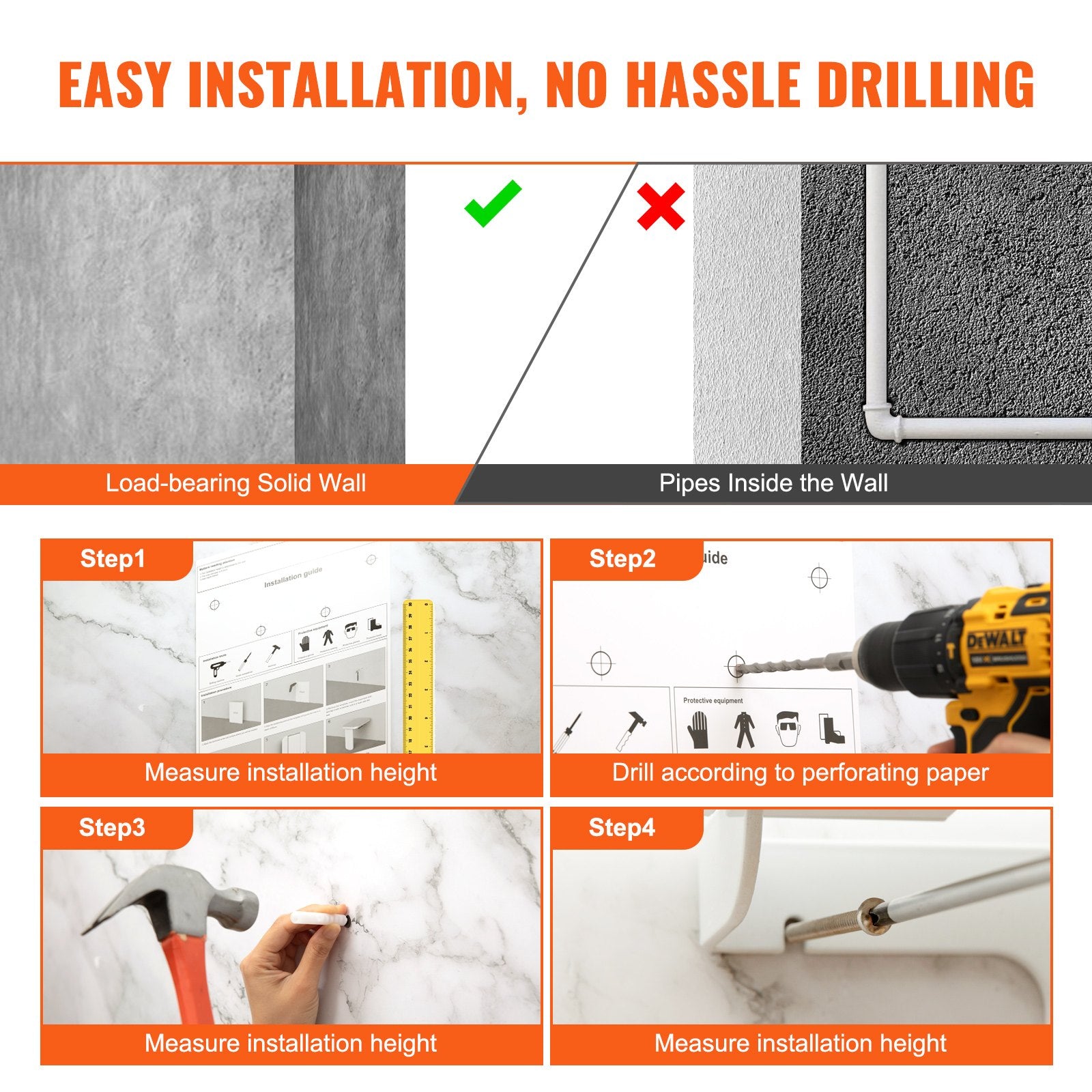- Drill-Hole Wall Mounting: Thoughtfully equipped with mounting hole guiding sticker for precise drilling – no need for additional markings with a pen. Complete with bolt cap, 304 stainless steel screws, and an extra set of 2 stainless steel screws and bolt caps for added convenience. Note: Install our folding shower seat on load-bearing solid walls.