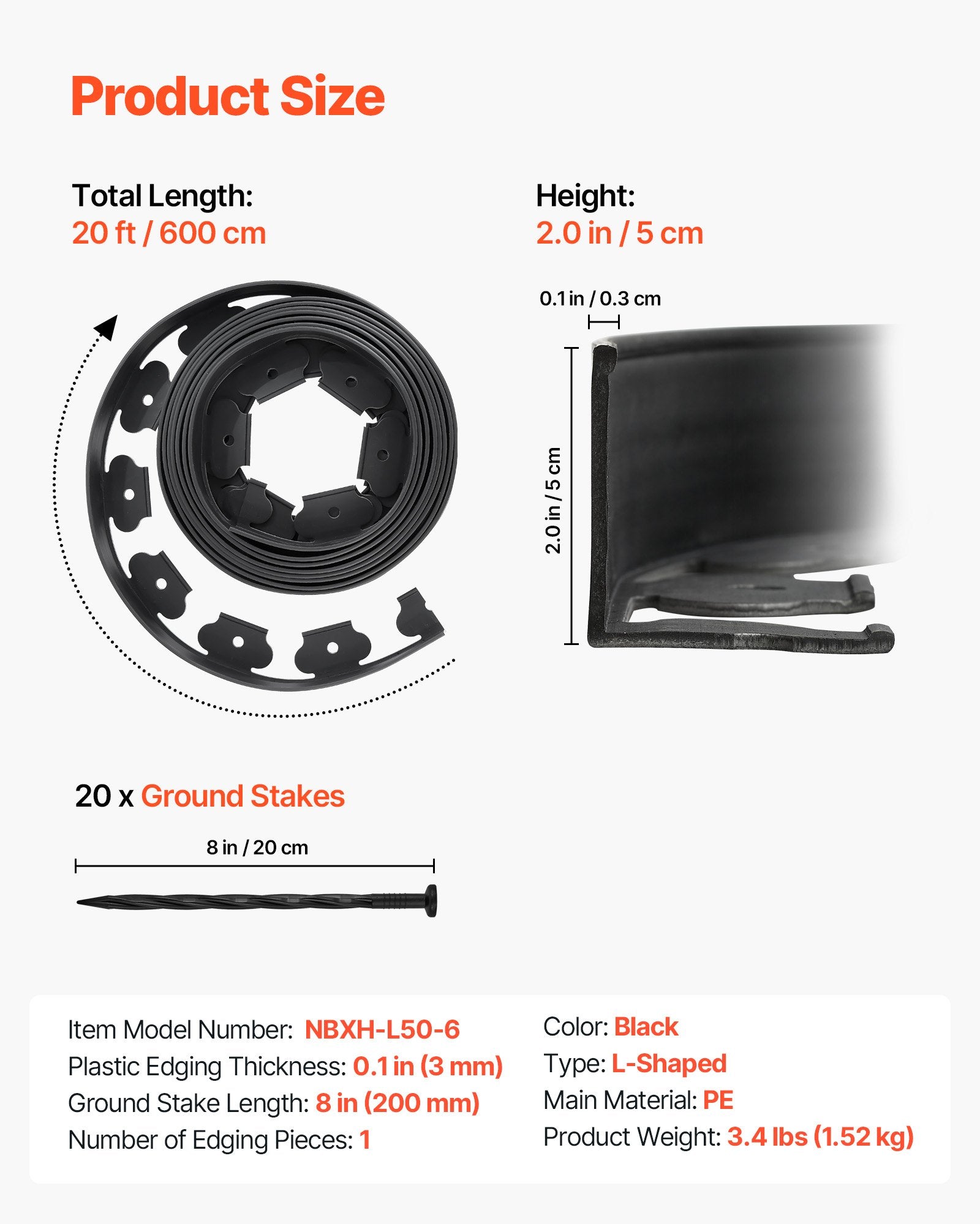- Plastic Edging Dimensions: 20 ft × 2.0 in (600 × 5 cm)