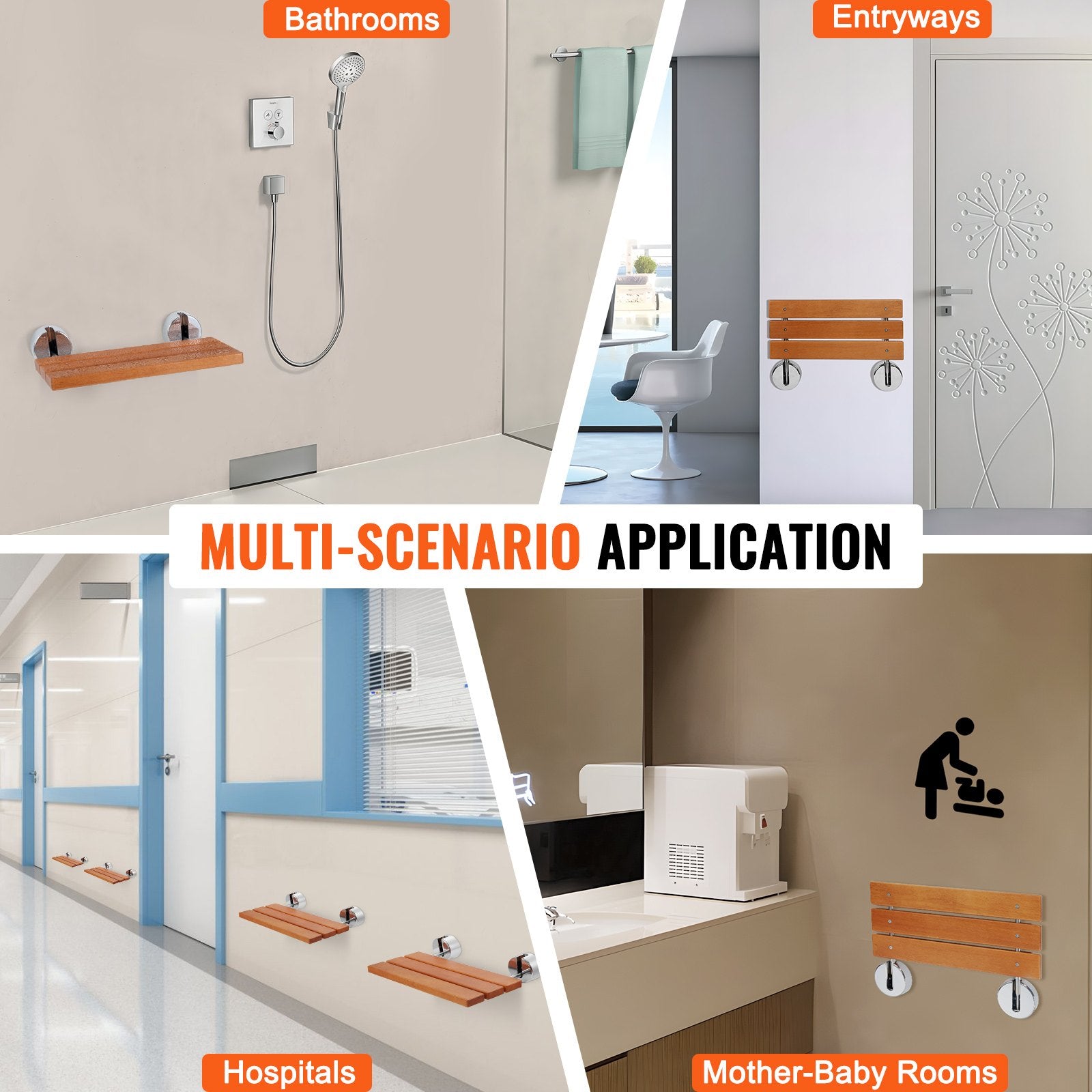 - From Bathrooms to Showers, and Beyond: Our wall-mounted shower seat isn't limited to just bathrooms and shower areas – it's also perfect for doorways, bedrooms, hospitals, nurseries, corridors, dressing rooms, boats, and more. Its sleek and minimalist design effortlessly blends into various decor styles, adding both functionality and aesthetic appeal wherever it's placed.