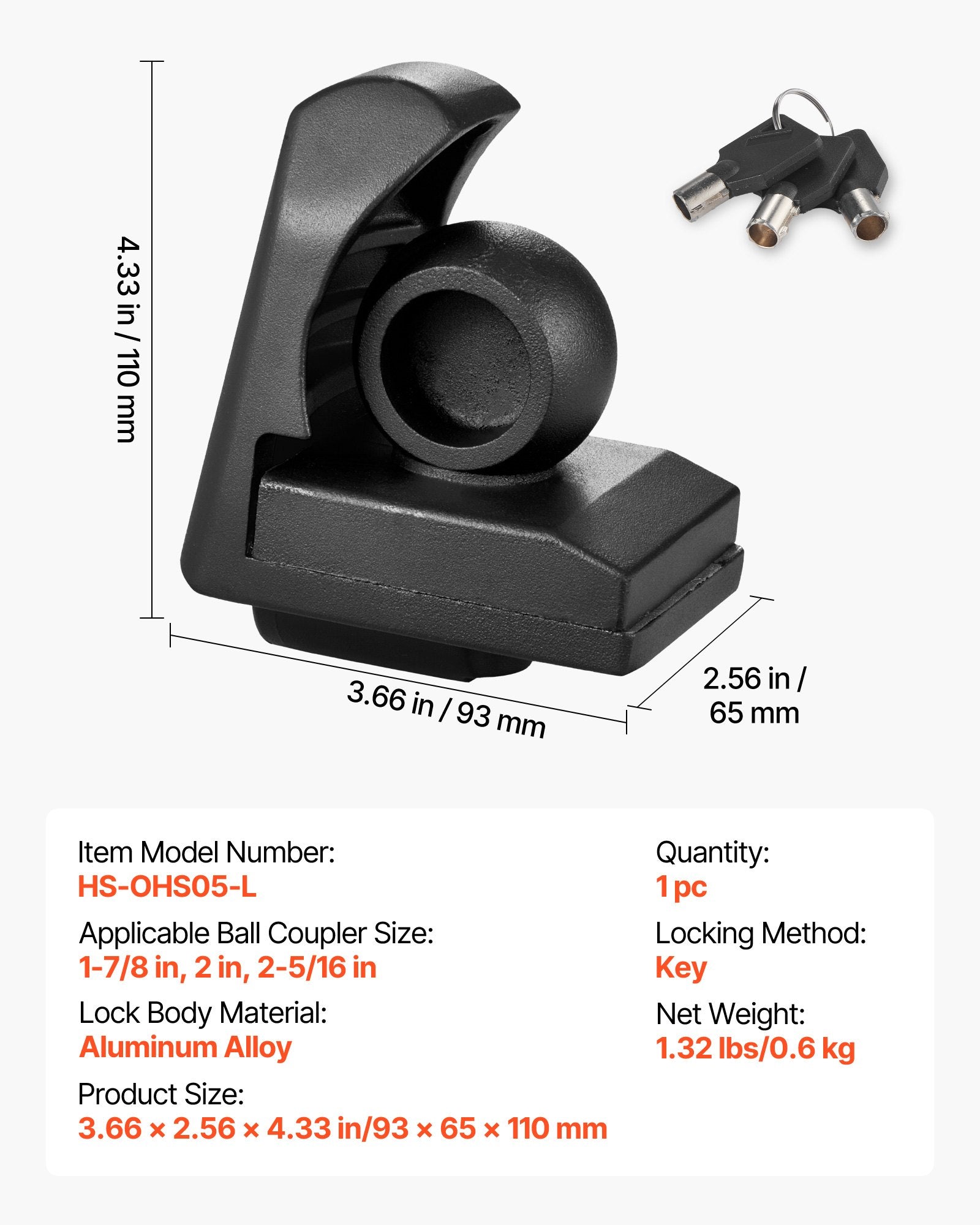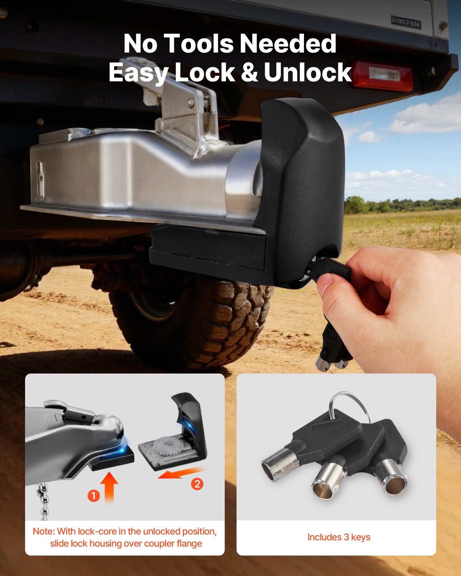 - Easy Operation: Our trailer ball lock operation requires no tools. You just need to insert the lock body into the coupler, adjust it to the right position, and use the keys to lock or unlock quickly. It includes three keys for convenient use anytime