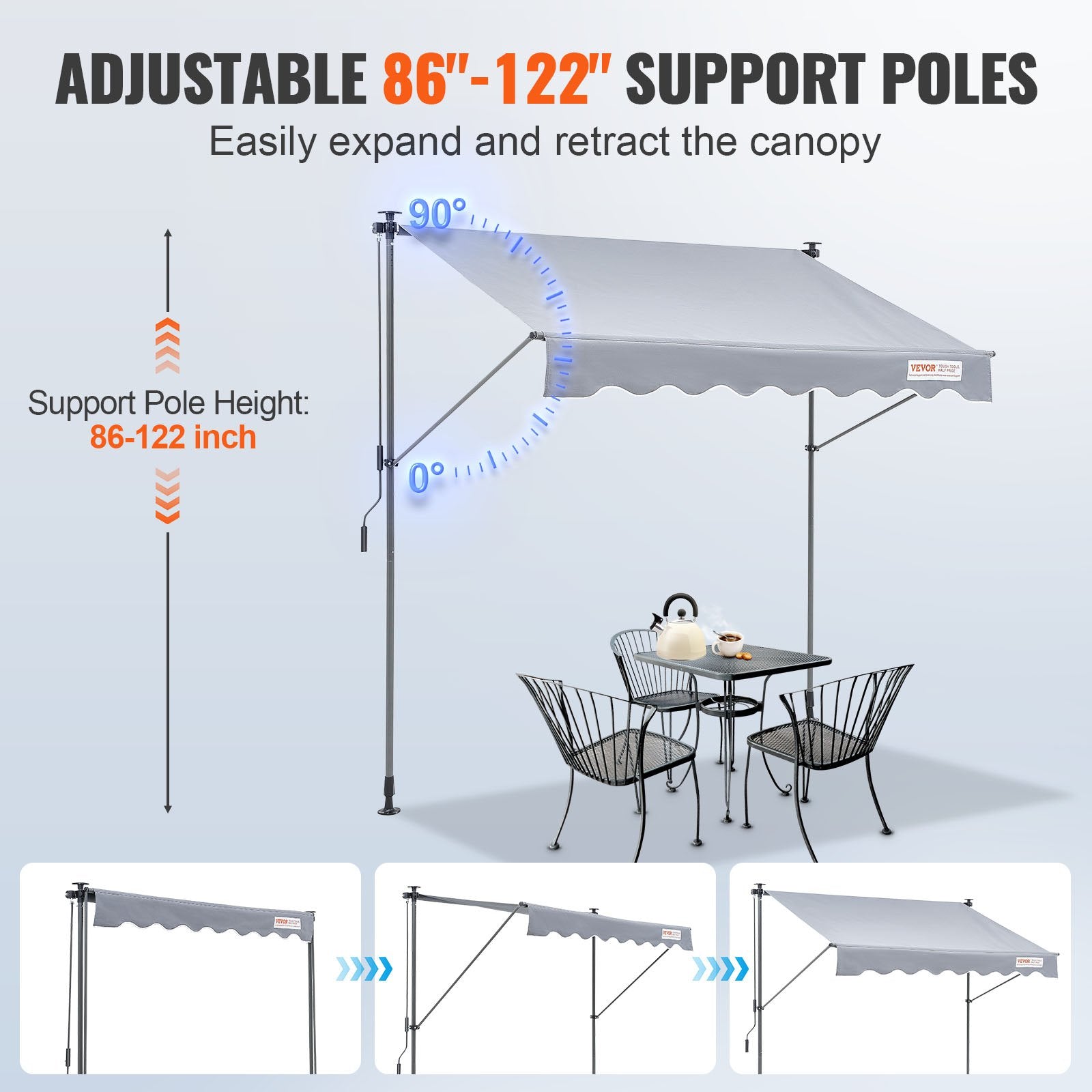 - Easy Adjustment: The retractable awning support poles can be adjusted in height from 86" to 122" to fit various door and window heights. Simply turn the crank handle to adjust the awning's angle from 0° to 90° for versatile shading options. It's easy to extend and retract as needed.