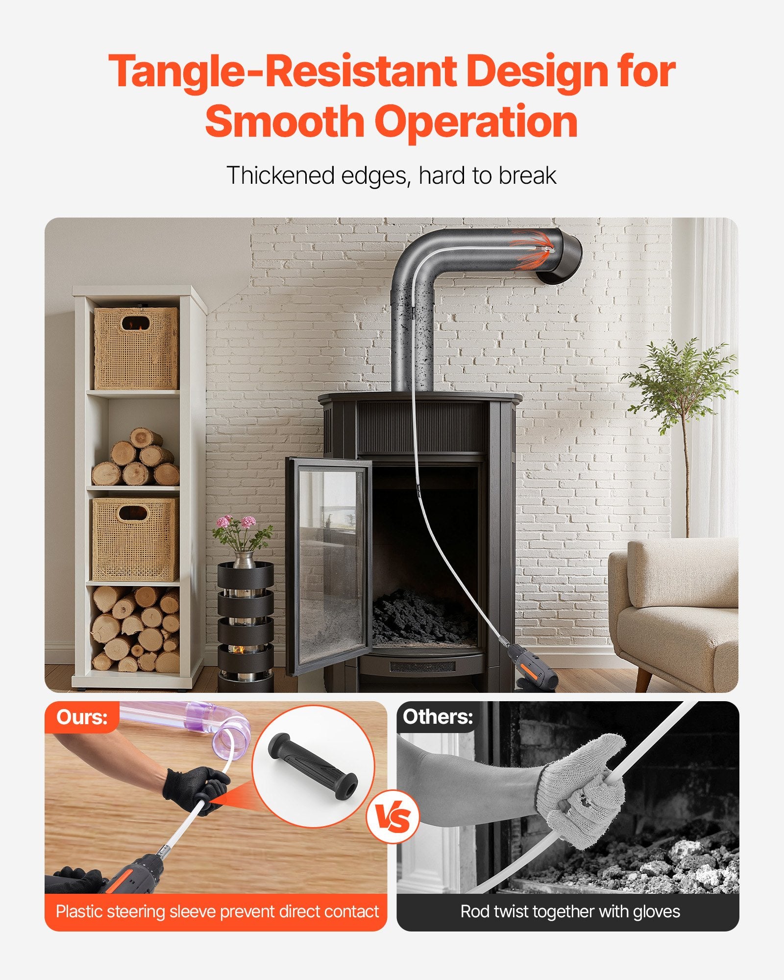 - Durable Flexible Rod: The 39ft / 12m nylon rod in this fireplace chimney brush is made from durable, high-strength fibers, designed for superior flexibility. It bends smoothly over 90° and is tough enough to avoid breaking or getting stuck, offering a hassle-free and efficient cleaning experience