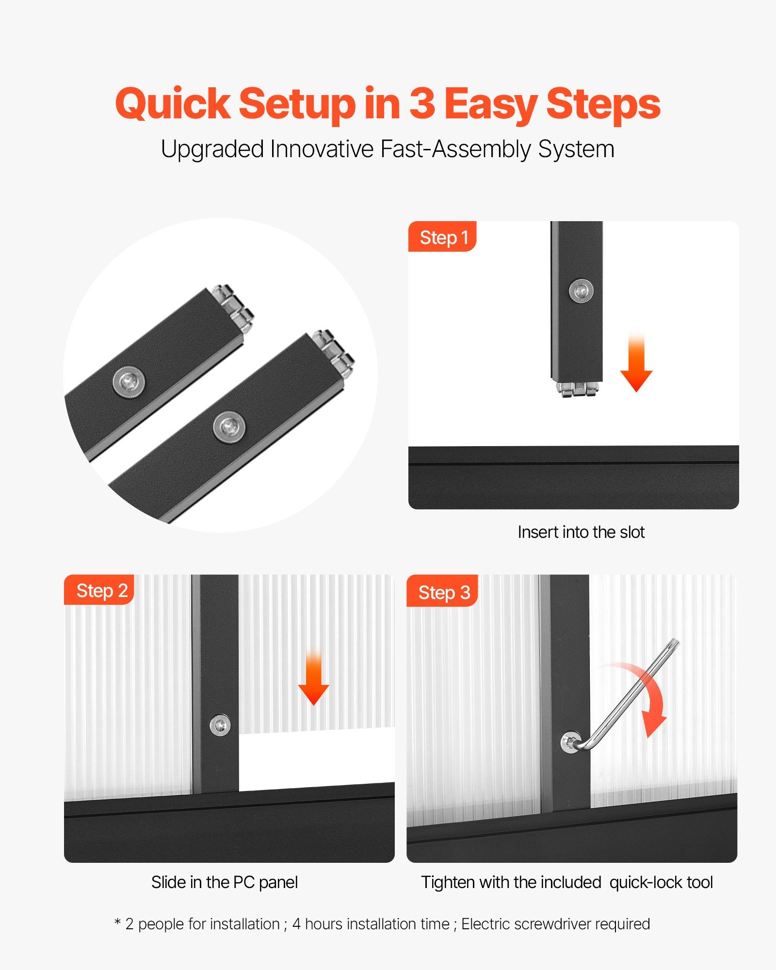 - Quick Assembly Design: The walk-in greenhouse features a quick-assembly system and slide-in panel design. With the included fast-lock tools, you can easily assemble the outdoor greenhouse in about 4 hours (recommended 2-person setup). Using the included tape or silicone sealant can further strengthen the structure and extend its lifespan.