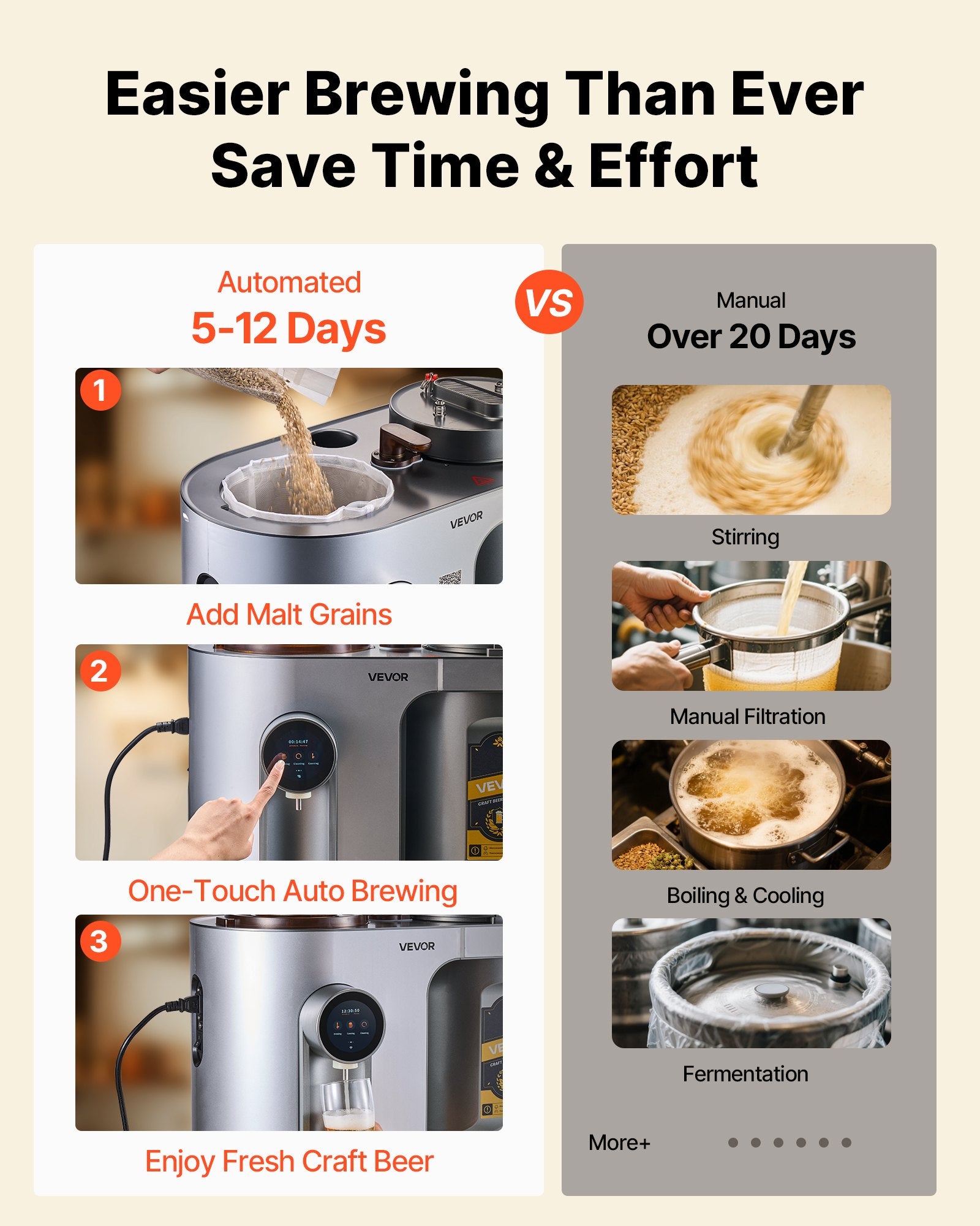 - One-Touch Smart Brewing: Simply add ingredients to start the process. The LCD screen guides every step, no manual transfer needed. Brewing time: 5–12 days. This automatic home brew machine includes 14 preset recipes plus DIY mode for creative brewers