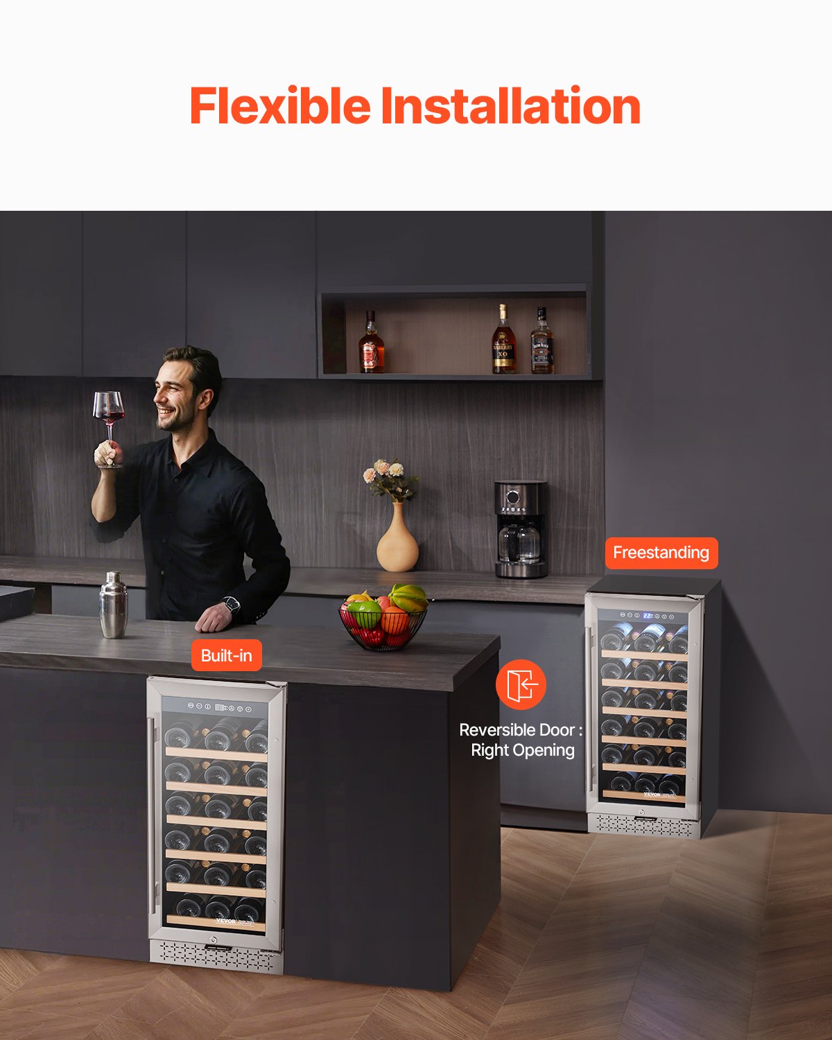 - Low-noise Functionality: Equipped with a premium compressor and fan, this wine refrigerator operates at a noise level of ≤45 dB. Enjoy an undisturbed environment as it works silently to keep your drinks chilled.