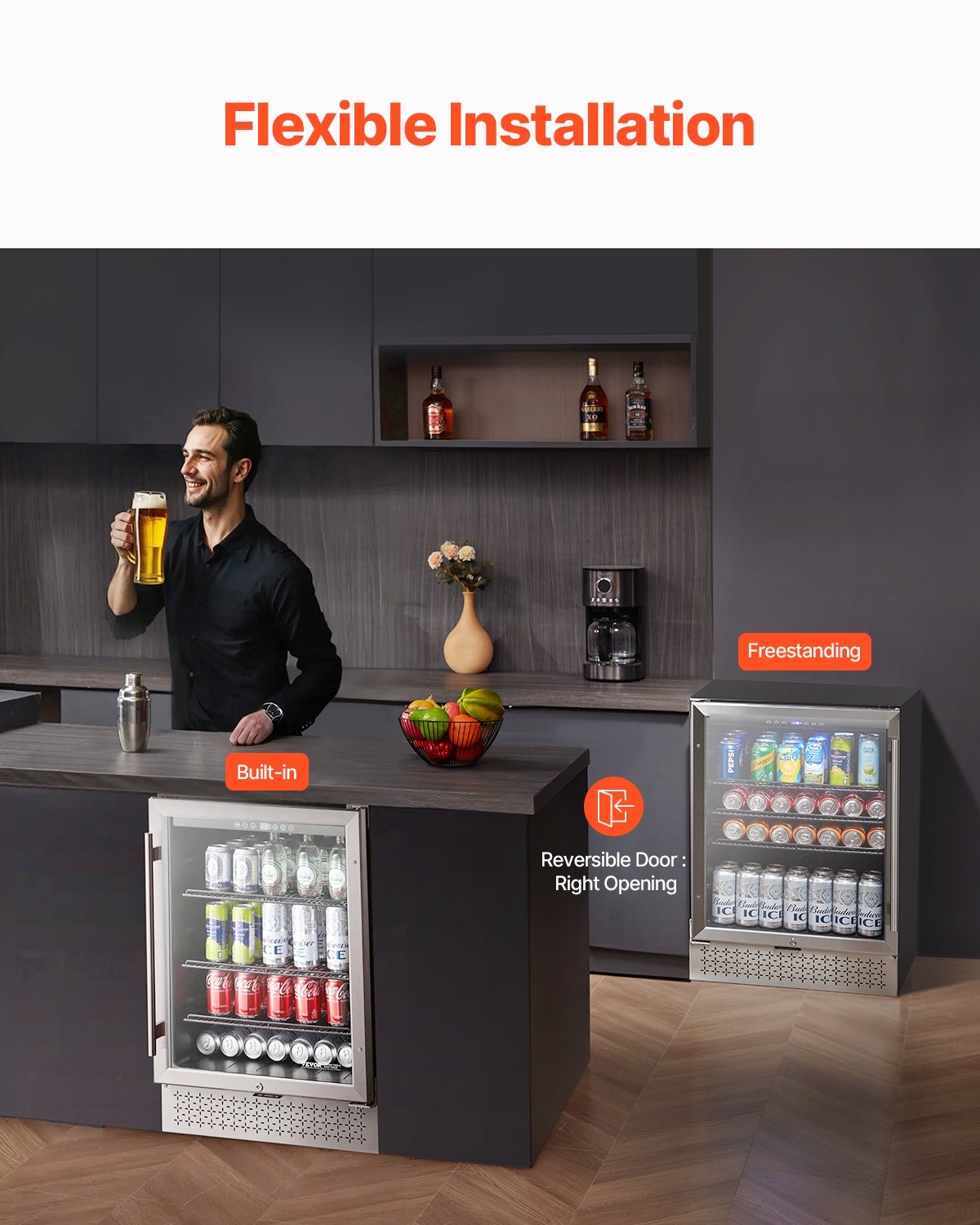 - Flexible Installation Options: Whether built-in or freestanding installation, the upgraded reversible door feature of our drink fridge with glass door allows you to adjust the door swing direction to suit your needs. Maximize convenience and optimize space effortlessly.