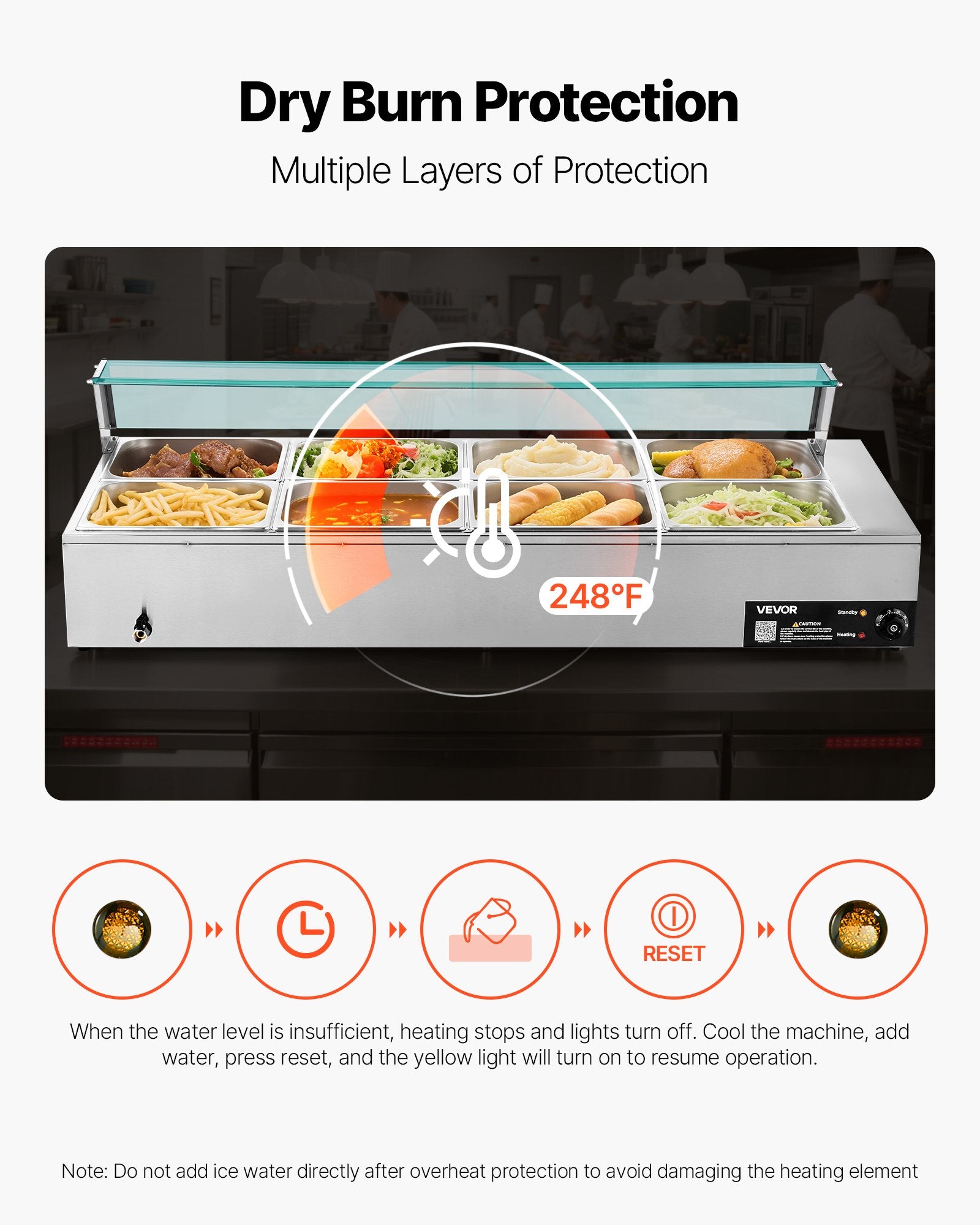 Commercial Food Warmer, 1700W Electric Stainless Steel Steam Food Warmer with Glass Cover, 8-Pan Countertop Buffet Bain Marie with Soup & Perforated Ladles, for Catering, Restaurant & Party