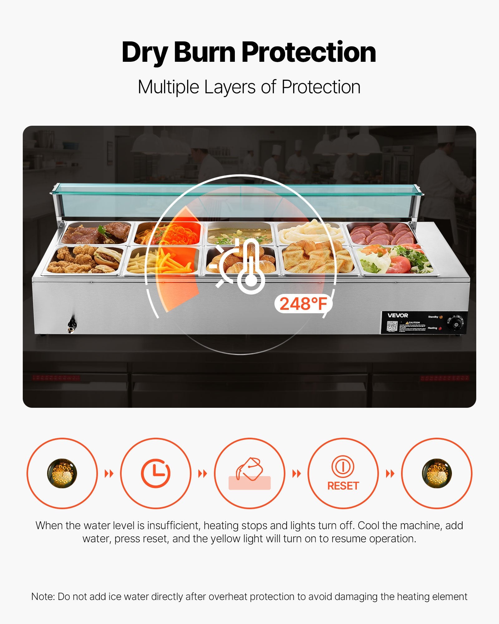 Commercial Food Warmer, 1700W Electric Stainless Steel Steam Food Warmer with Glass Cover, 10-Pan Countertop Buffet Bain Marie with Soup & Perforated Ladles, for Catering, Restaurant & Party