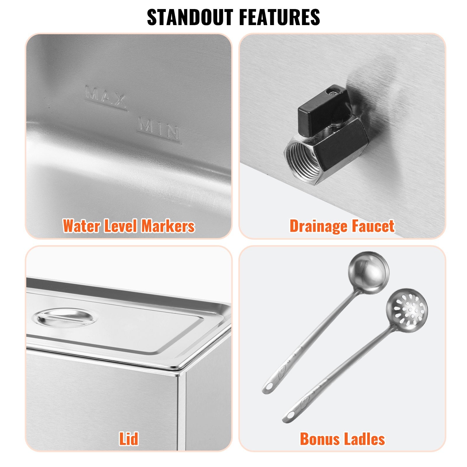 - Robust Stainless Steel Build: This food warmer is built to last, with a sturdy all-stainless steel construction that can withstand constant use, and is easy to clean and maintain. The well has a thickened wall (0.03" / 0.8 mm thick) that provides additional sturdiness and has a secure water seal.