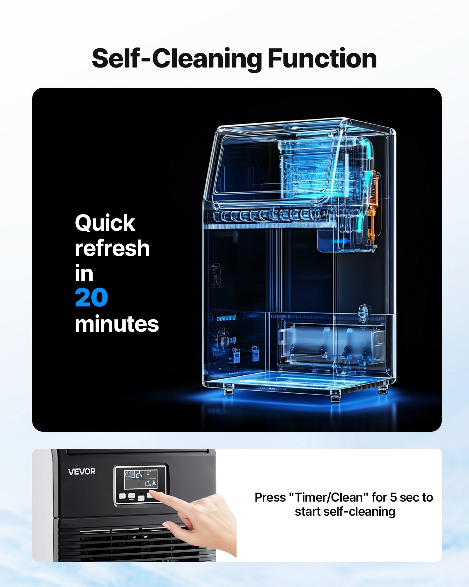 - Easy to Clean: This self-cleaning ice maker runs a 20-minute automatic rinse cycle with a 3-second press of the “Mode” button. The patented removable water tray lets you lift and rinse for deep, thorough cleaning—inside and out