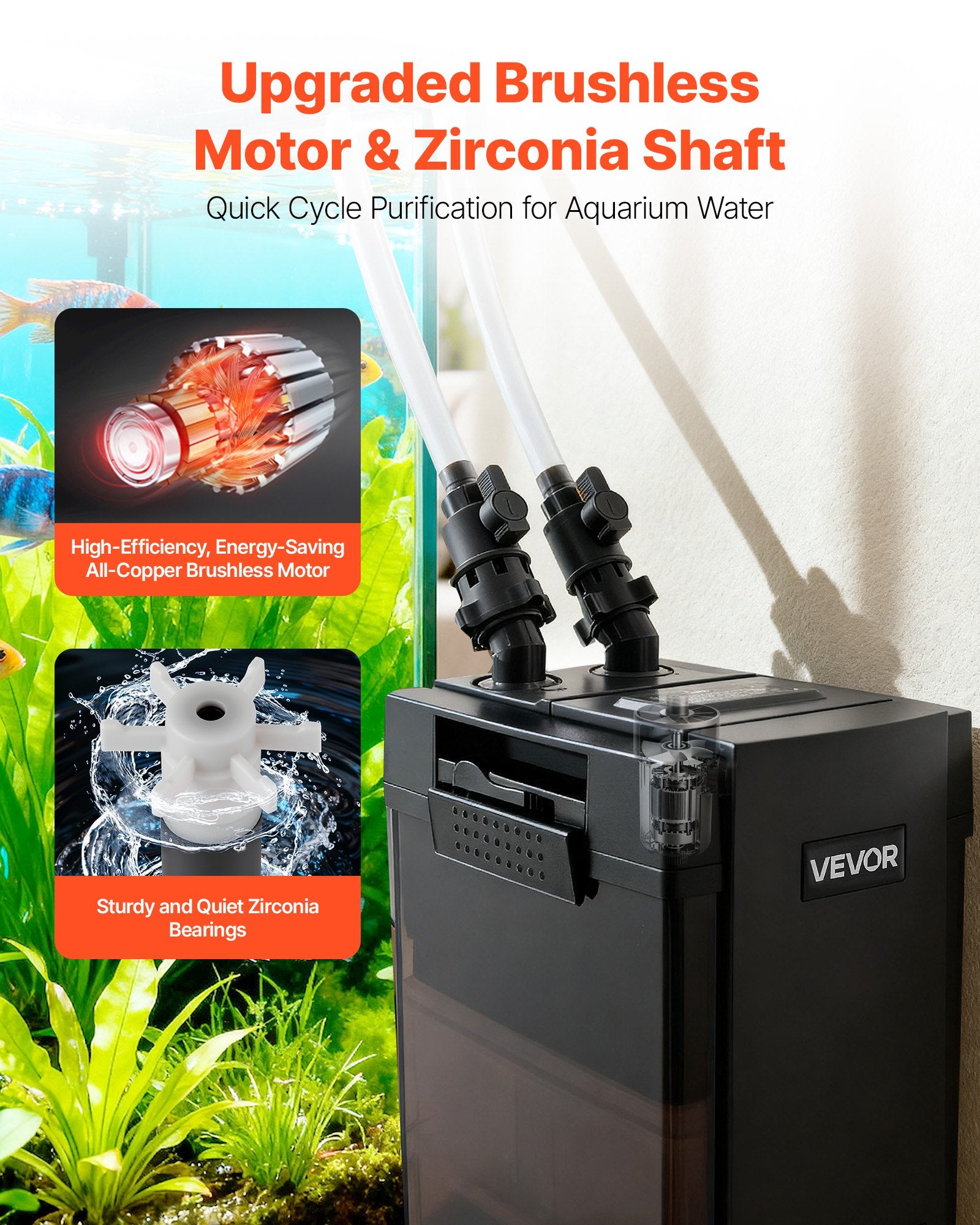 - Upgraded Motor: Featuring a full-copper brushless motor and a zirconia bearing, the canister aquarium filter can circulate and purify water, while reducing energy consumption. Its bearing’s hardness and wear resistance ensure stability for lasting use