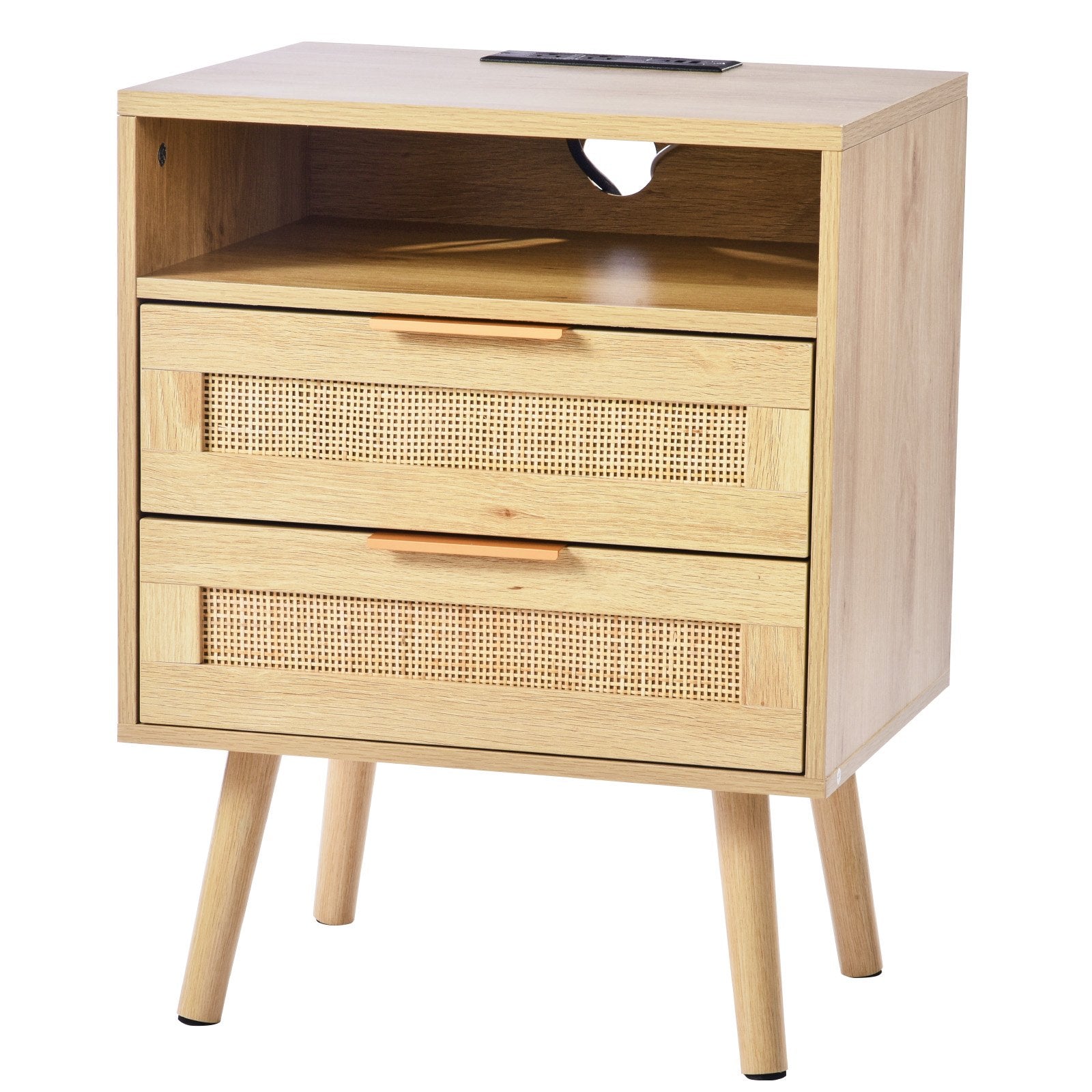 Rattan Nightstand, Boho Bedside Table with Open Shelf 2 Drawers, Rattan End Table Nightstand with Solid Wood Legs, Rattan Bedside Table with Charging Station, for Bedroom, Study & Living Room