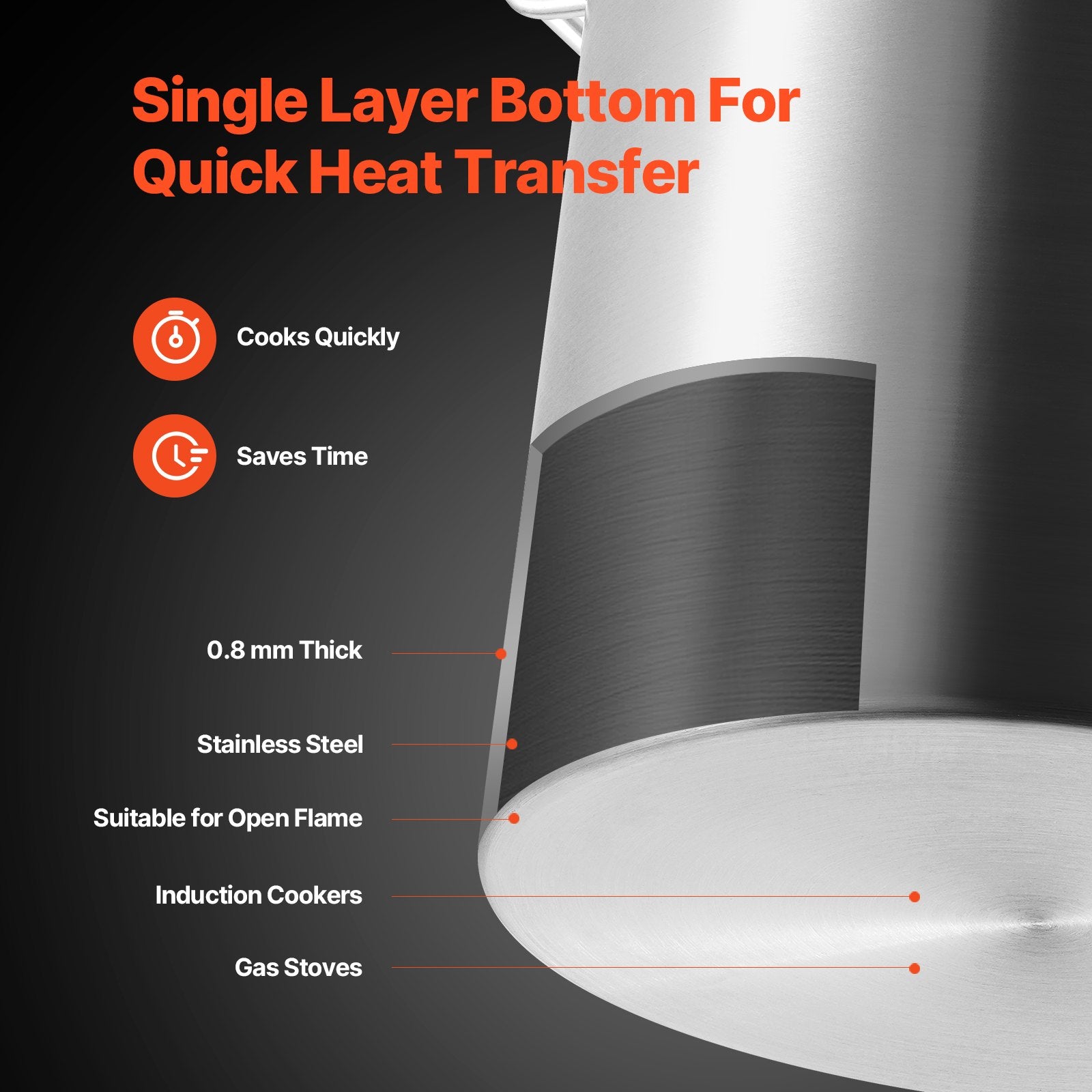 - Quick Heat Transfer Single-Layer Bottom: The heavy duty stock pot's bottom thickness is 0.8 mm and can be used on open flames and gas stoves. The pot enhances cooking efficiency through quick heat transfer, saving you precious time.