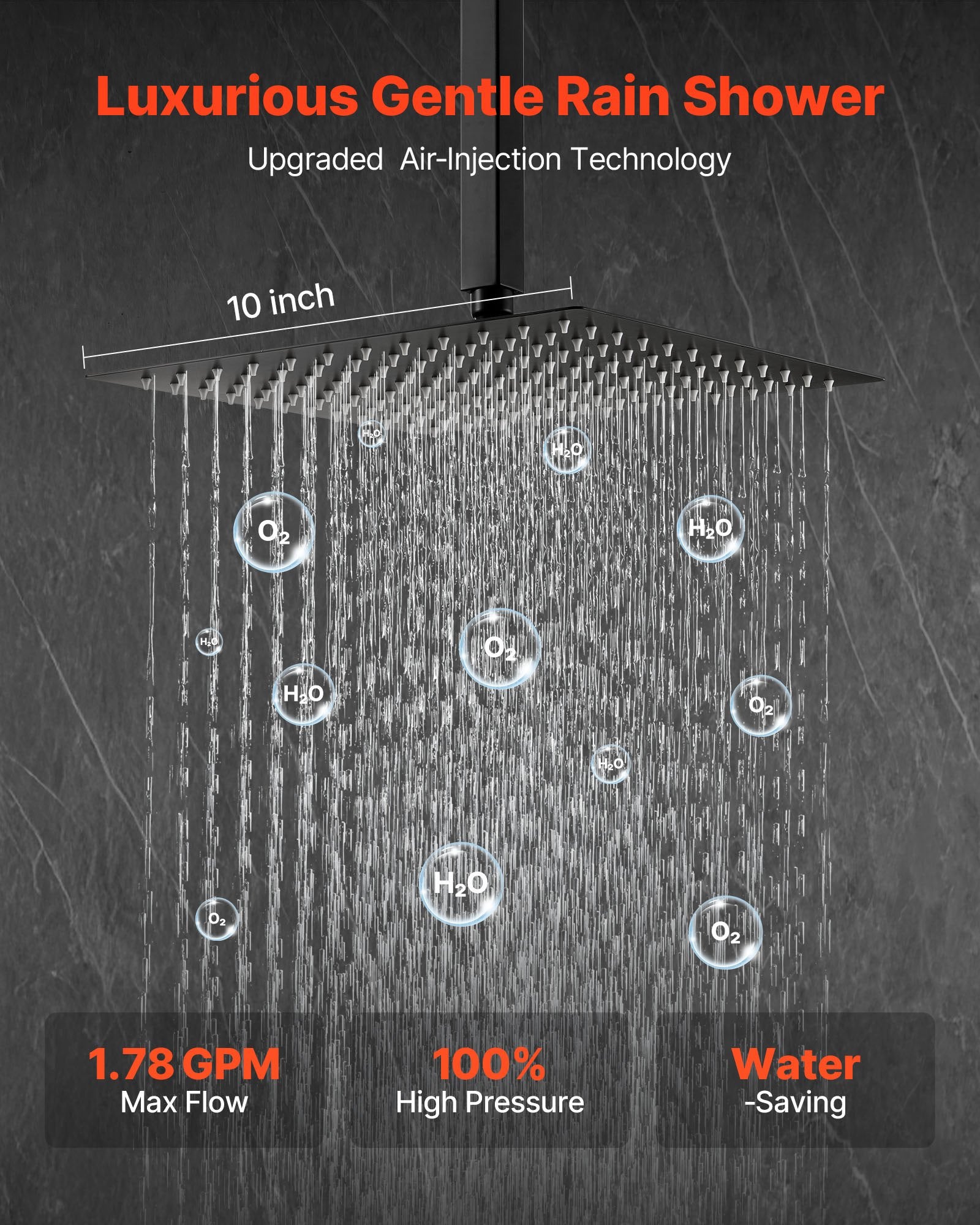 - High-Pressure Shower: Our dual-function shower system provides a luxurious experience with air-injection technology, ensuring high pressure even under low water conditions. Save water with 1.78 GPM flow rate, offering a spa-like, relaxing shower