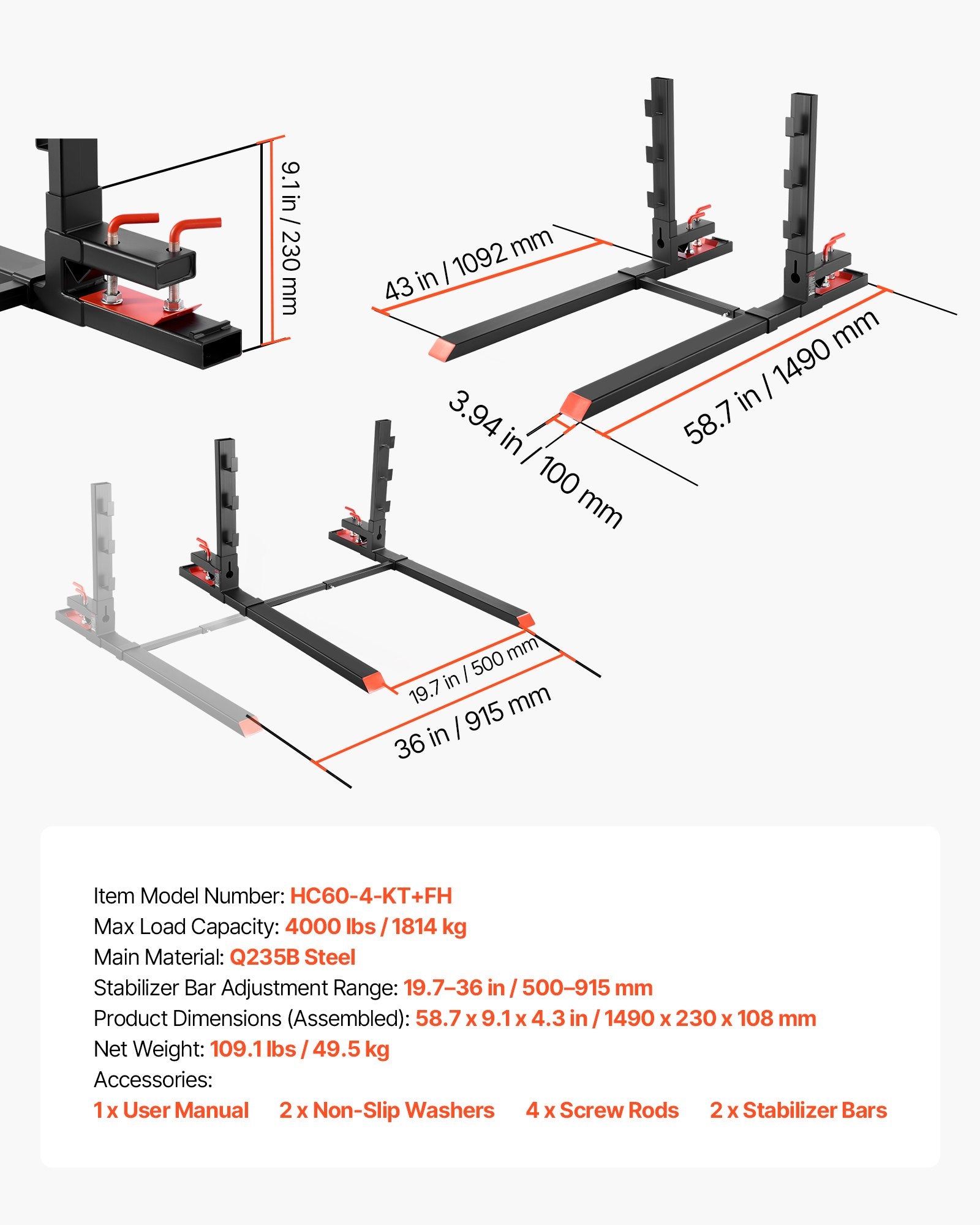 - Adjustable Stabilizer Bar: The 19.7–36 in (500–915 mm) adjustable range of the tractor forks keeps forks aligned, avoids load slide, and spreads side pressure for more secure, smoother handling