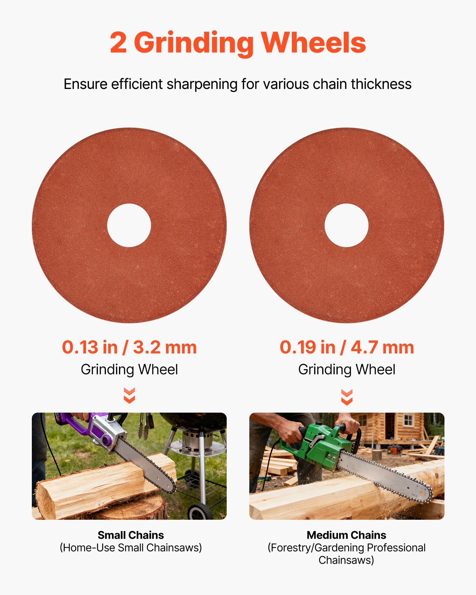 - 2 Grinding Wheels: This electric chain sharpening tool includes 2 grinding wheels: 0.13"/3.2 mm thick (pre-installed) fits small chains like household small electric saws, and the 0.19"/4.7 mm thick fits medium chains like forestry/horticulture electric saws