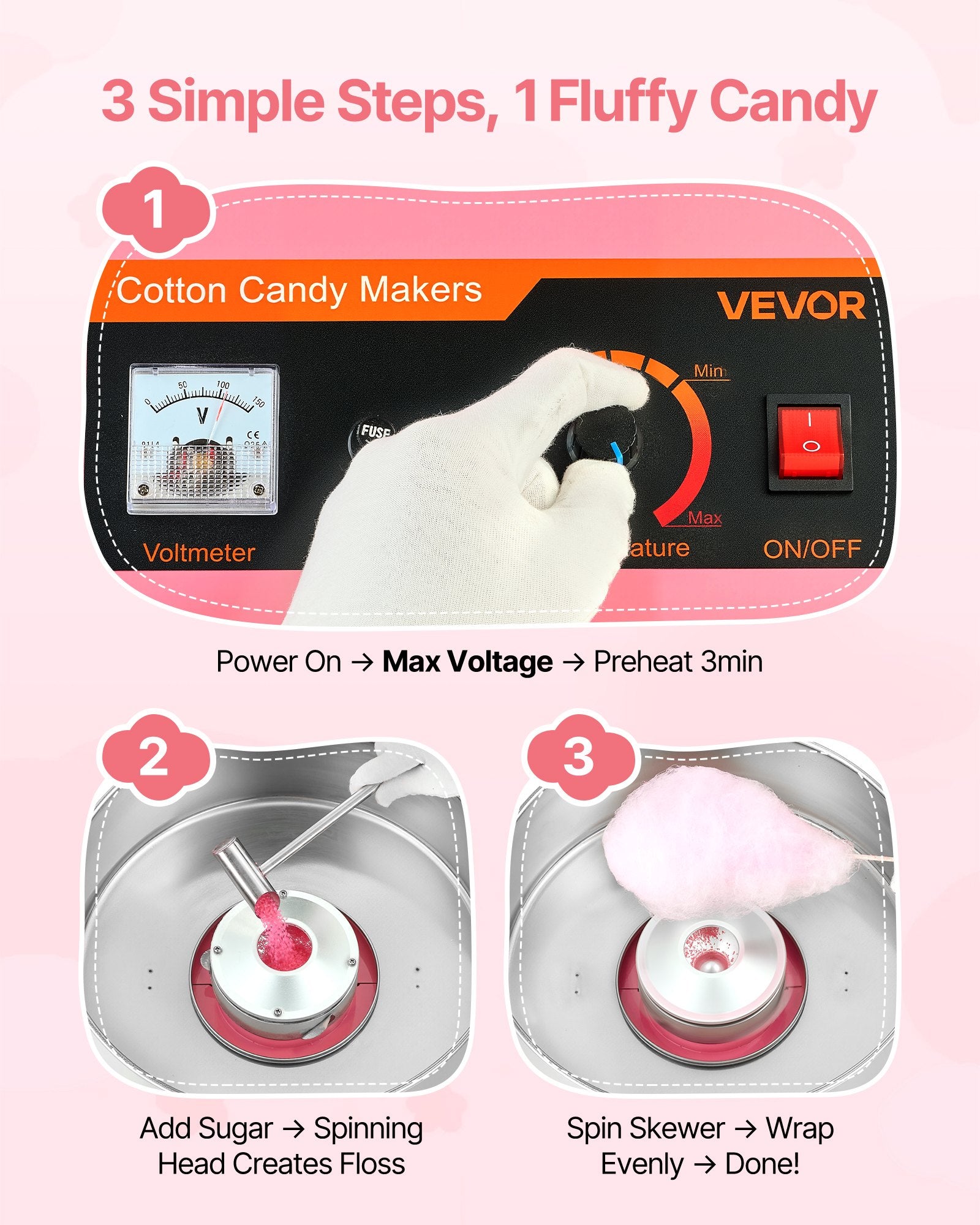 - 3 Step Easy Operation: 2-3 min preheat, adjust power via voltage knob (max voltage recommended). Just "power on-add sugar-collect"—voltage display aids temp control. This cotton candy maker has not complex settings, suitable for beginners to master