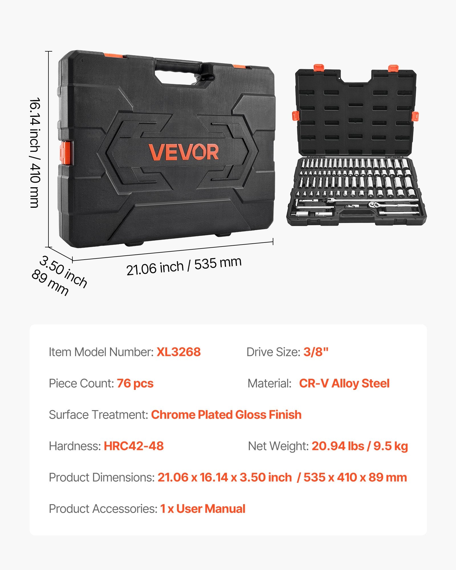 Socket Set, 76 Pieces, 3/8 inch Drive Socket and Ratchet Set, SAE and Metric, Deep and Shallow, Mechanic Tool Kit with Accessories and Storage Case, CR-V Alloy Steel, for Automotive Repair