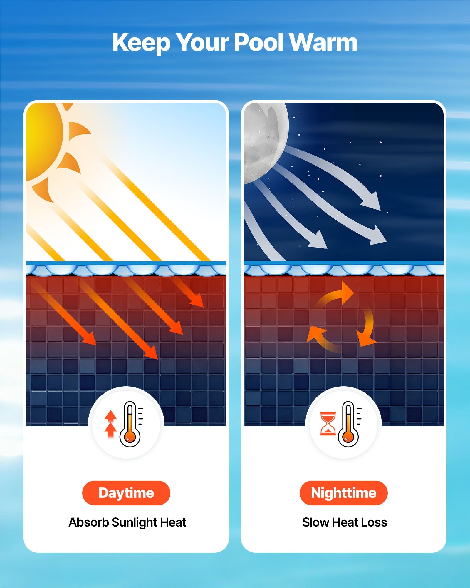 - Solar Heat Lock: This pool solar blanket absorbs natural sunlight through tightly packed micro bubbles, creating an effective heat retention layer. It heats the pool during the day and keeps it warm at night, reducing the need for extra energy to maintain water temperature