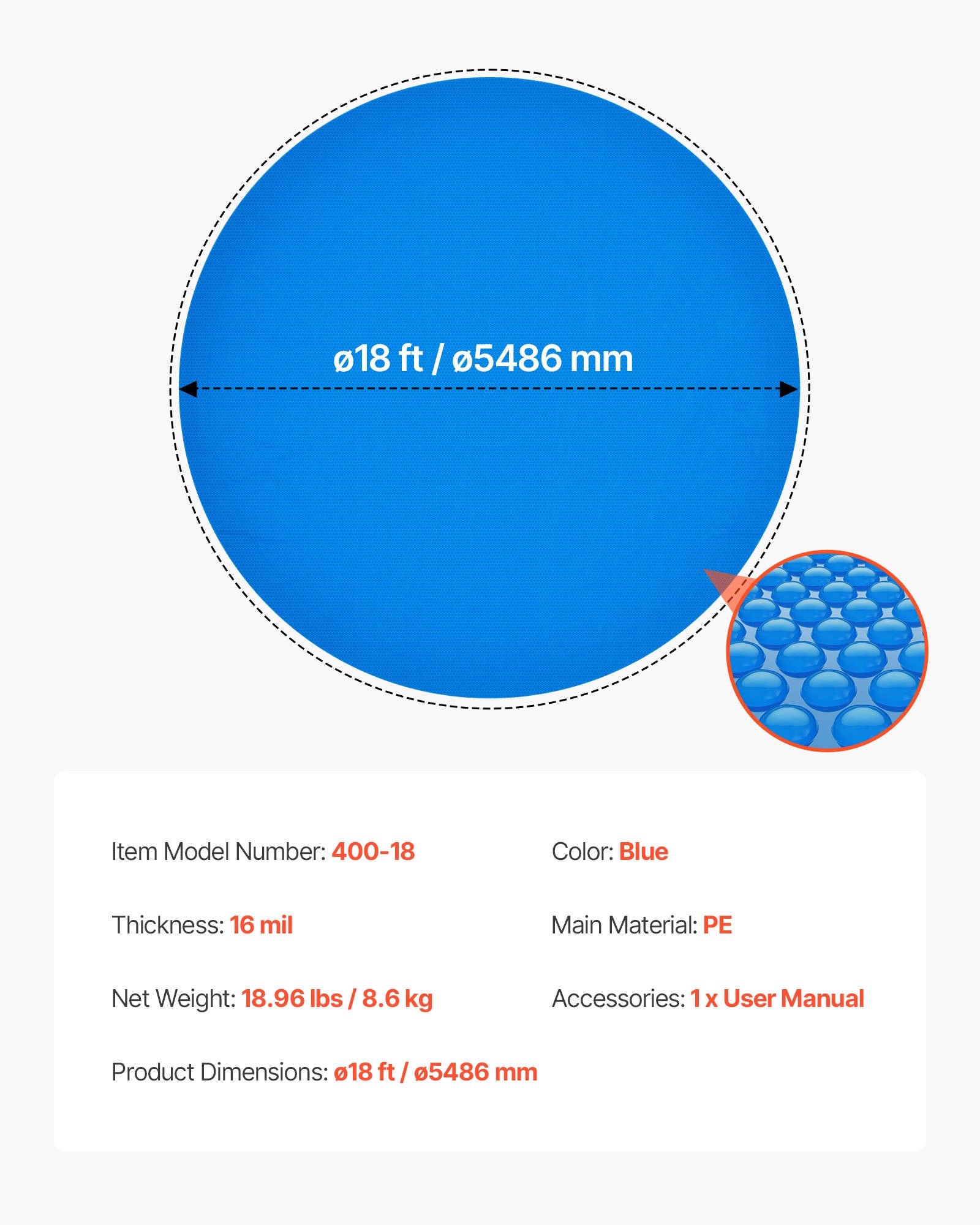 Solar Pool Cover, 18 ft Round Pool Bubble Cover, 16 Mil Pools Solar Blanket with Bubble & PE Material, Daytime Heat Absorption, Nighttime Heat Retention, Heat Retaining Solars Covers, Blue