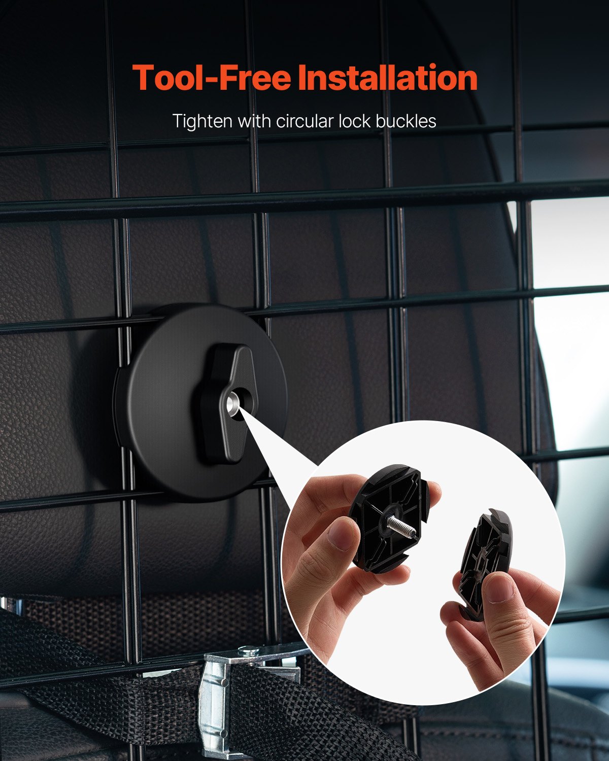 - Tool-Free Installation: Our dog car barrier comes with circular locks, nylon straps, and elastic cords for secure attachment to the headrests. It requires no tools for installation, ensuring easy setup and a firm, slip-resistant hold.