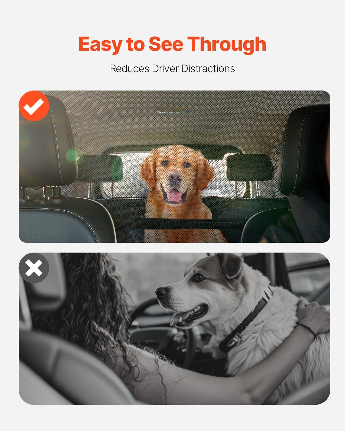 - Clear Visibility: The fine woven mesh of the dog car barrier ensures clear visibility to the rear seat, without obstructing your view for secure driving. It also effectively stops your pet from jumping into the front seat, reducing distractions and ensuring the security of both your pet and all passengers during the journey.