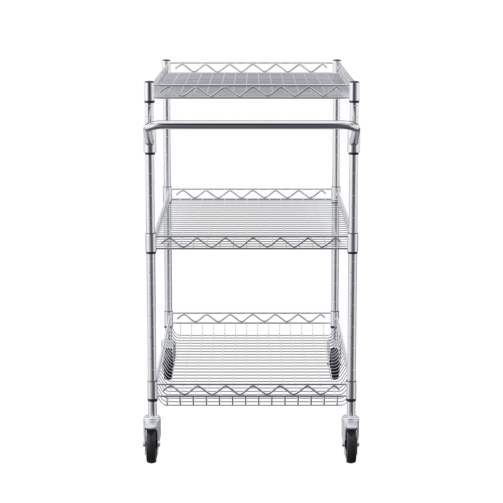 Kitchen Utility Cart, 3 Tiers, Wire Rolling Cart with 661LBS Capacity, Steel Service Cart on Wheels, Metal Storage Trolley with 80mm Deep Basket Curved Handle 6 Hooks, for Indoor and Outdoor Use