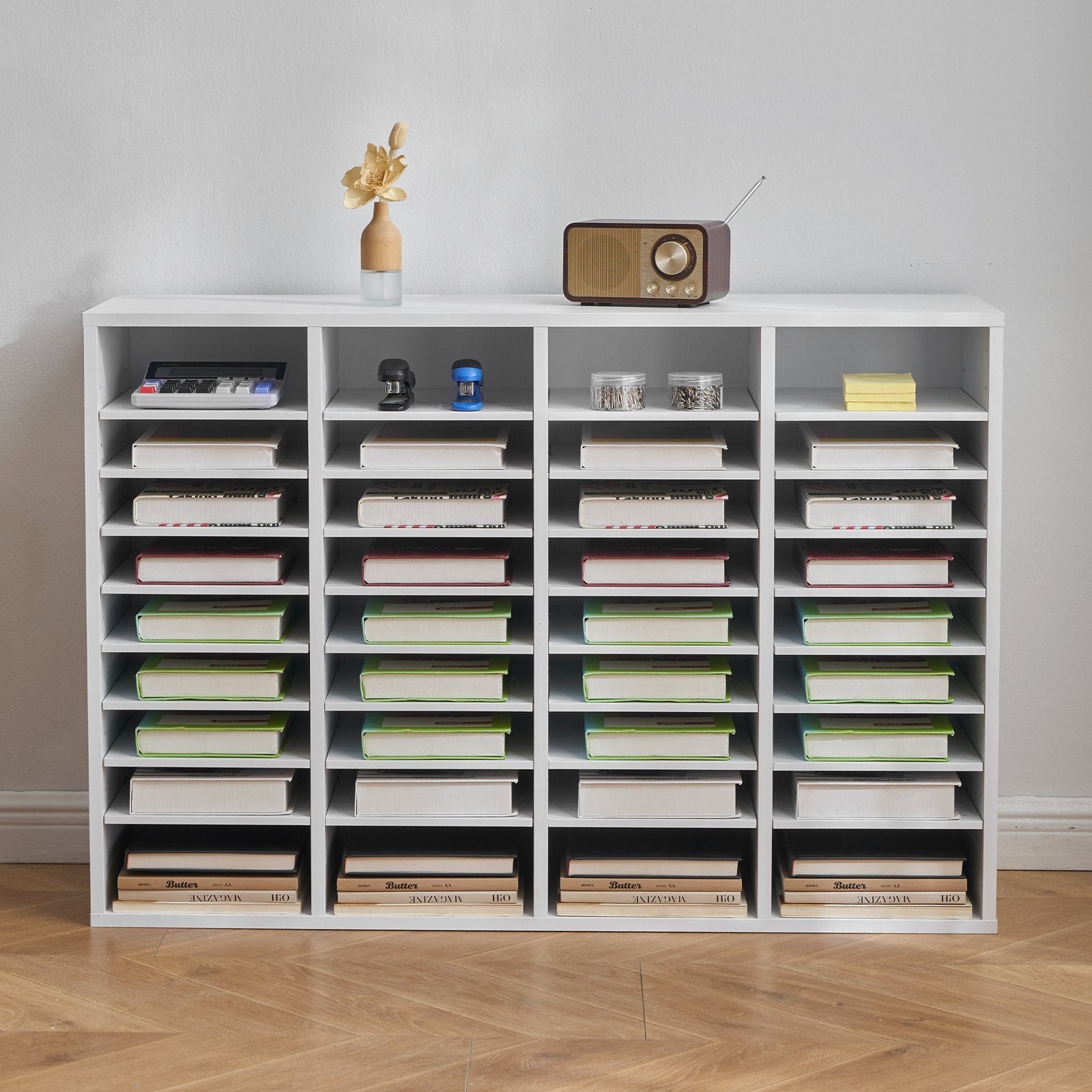 - Spacious 36-Compartment Design: Meet our literature organizer—your new solution to a clutter-free workspace! With 36 roomy compartments arranged in 4 column and 9 rows, you'll have plenty of space to neatly store books, documents, magazines, and more.