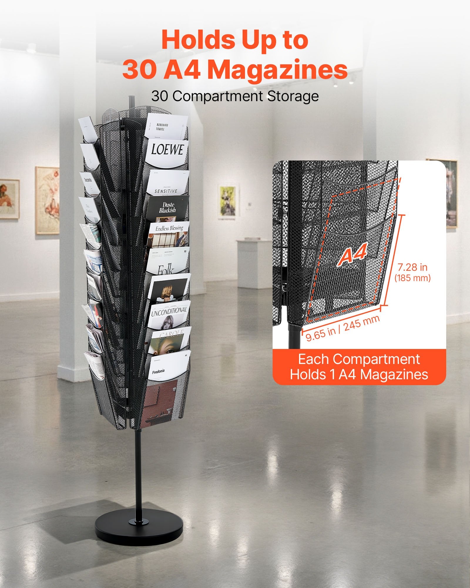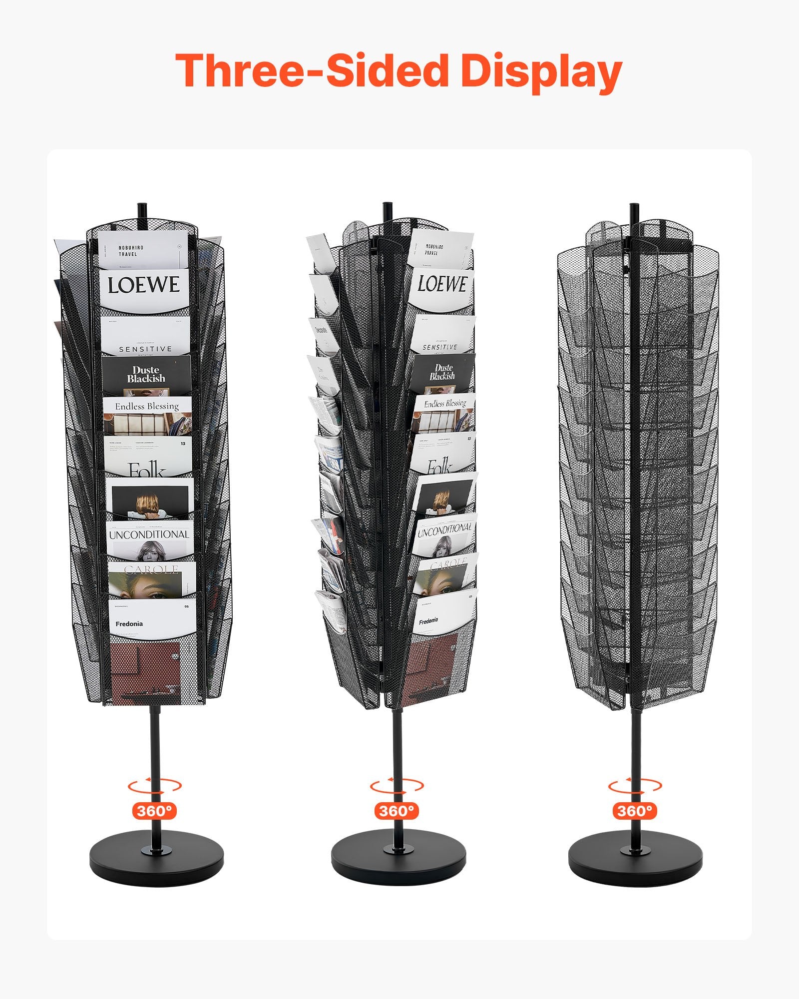 Rotating Brochure Display Rack, 30 Pockets Mesh Magazine Literature Display Stand, Portable Floor Standing Magazine Rack, Metal Newspaper Catalog Holders for Shop Exhibitions Office Trade Show