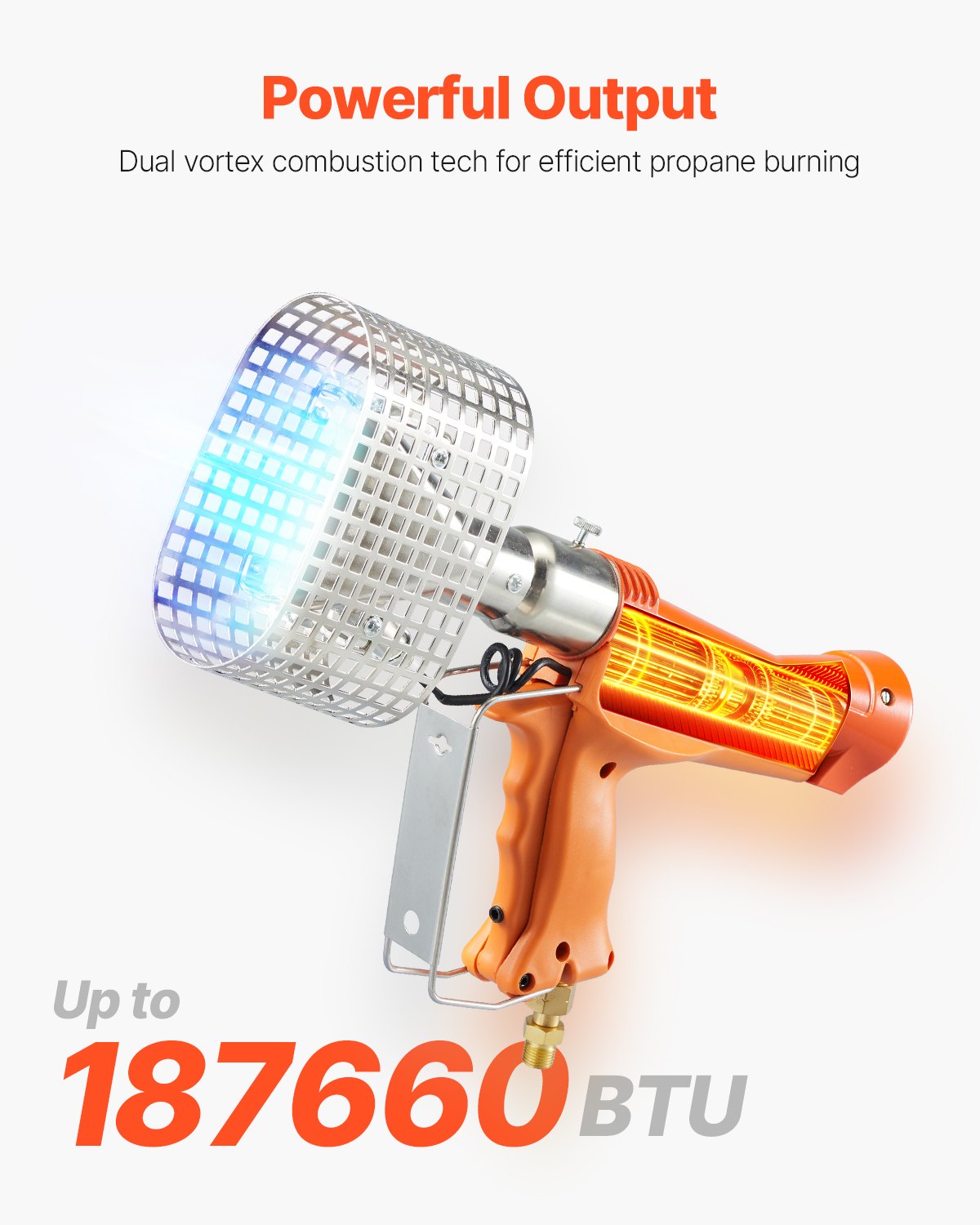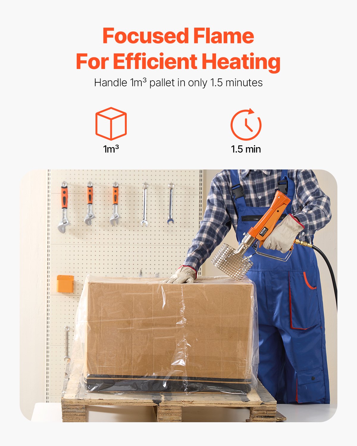 - Efficient Heating Performance: This propane heat gun delivers a powerful 187,660 BTU output, heating 1 cubic meter pallet wrap in just about 1.5 minutes. Ideal for large-area shrink wrapping, the propane heat tool boosts efficiency.