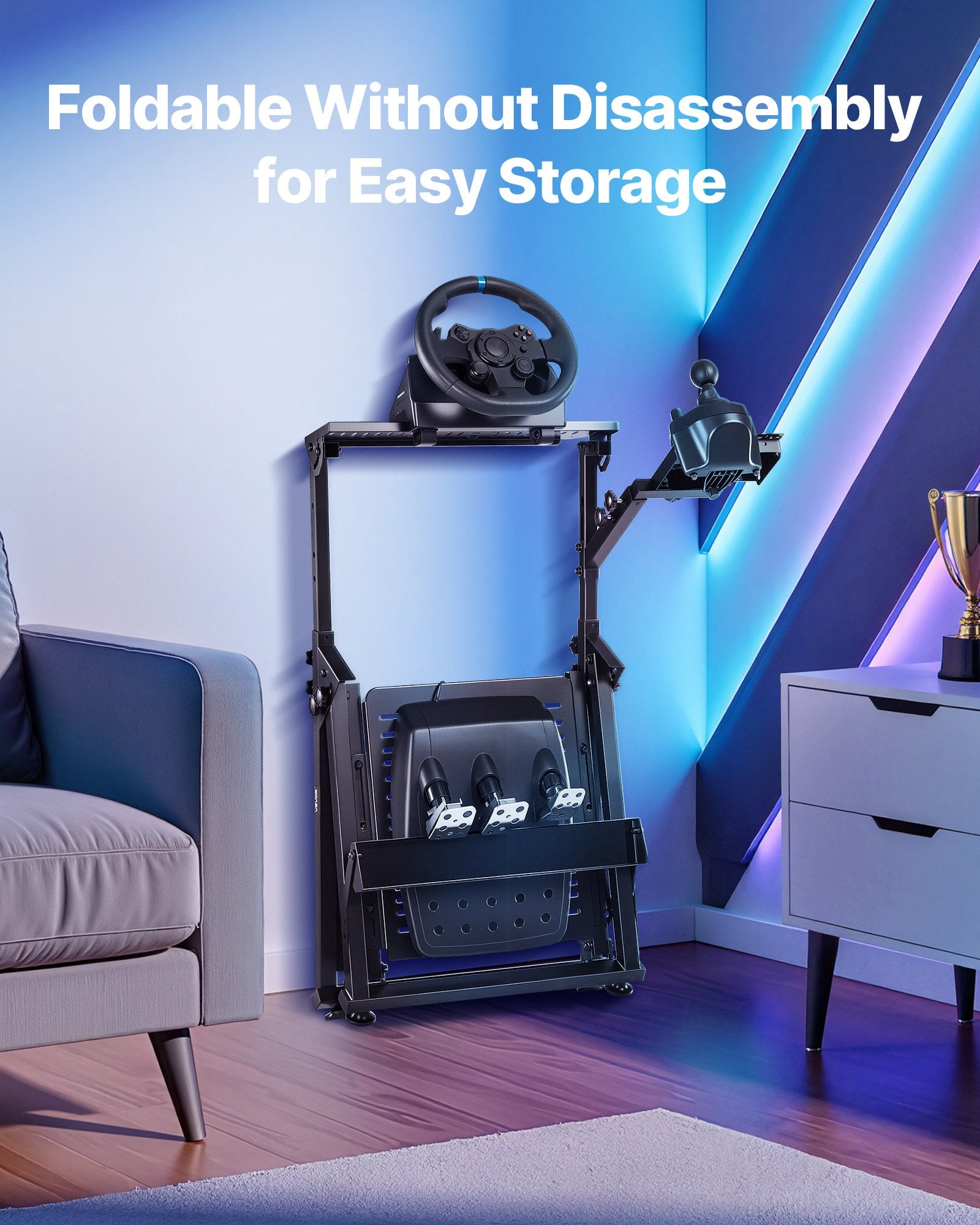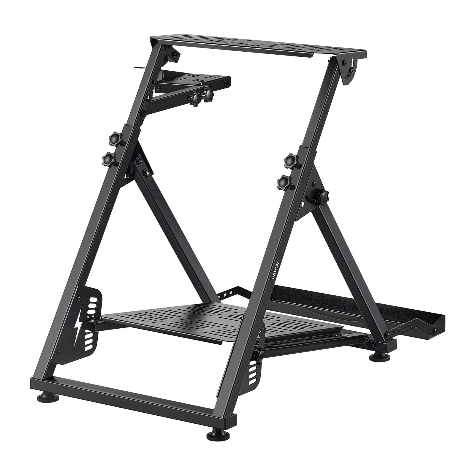 - Quick Folding Design: This racing simulator cockpit folds easily without disassembly to save space. Just fold and store it effortlessly. Whether your gaming area is large or small, this racing wheel stand adapts and keeps your setup neat