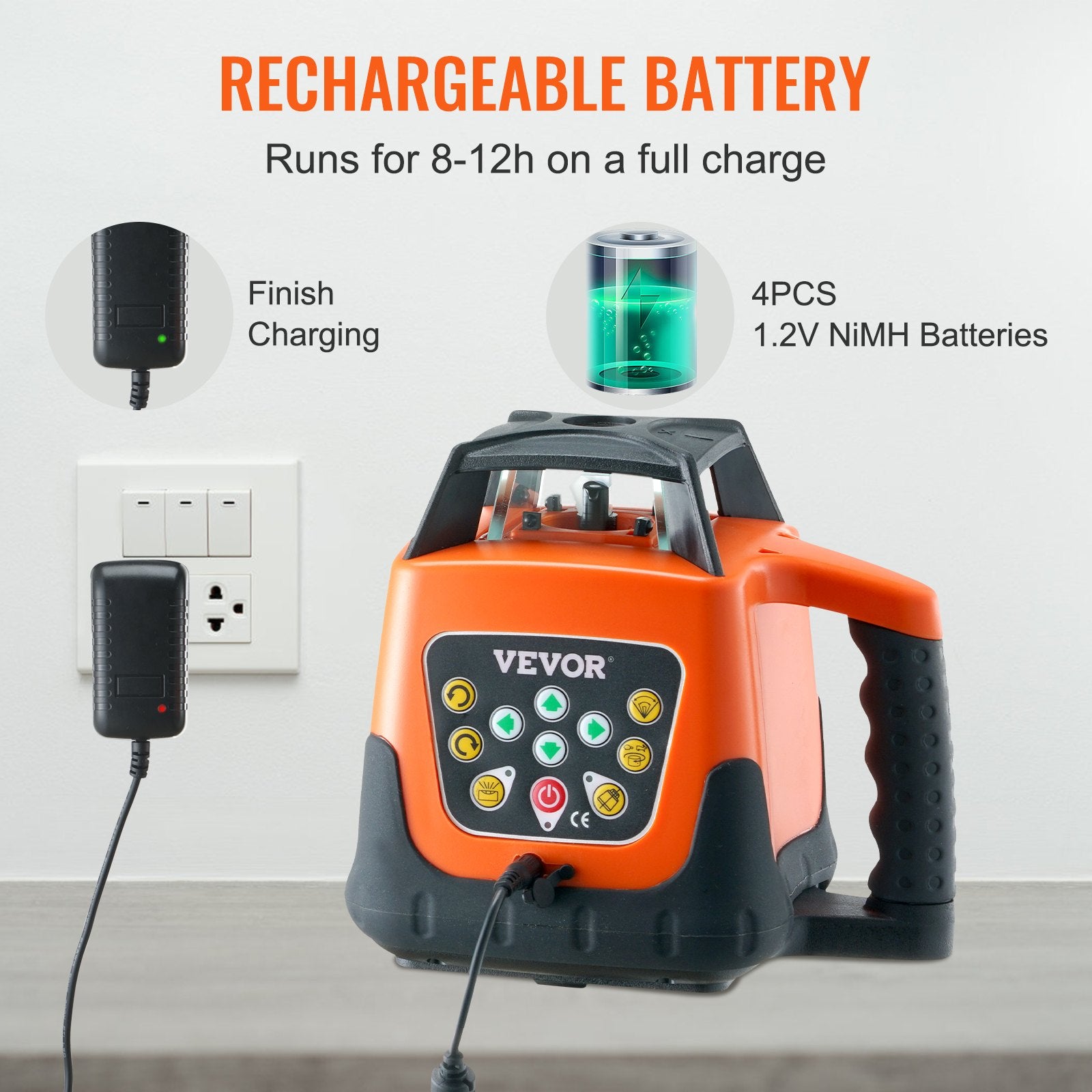 - Rechargeable Battery: Are you ready to dive into power? Our level laser tool is powered by 4PCS 1.2V NiMH batteries that run for 8-12 hours on a full charge (including charger), ensuring that you'll be able to complete your tasks efficiently without the need to frequently recharge or replace batteries when things matter most.