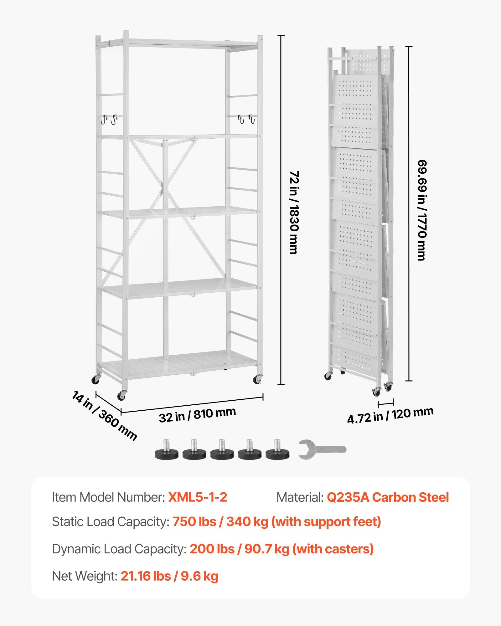5-Tier Foldable Storage Shelf, 32W x 14D x 72H Inch Folding Metal Rack Shelving Unit, No Assembly Organizer Shelf with 5 Wheels & 4 Hooks for Pantry, Kitchen, Garage, Basement, White