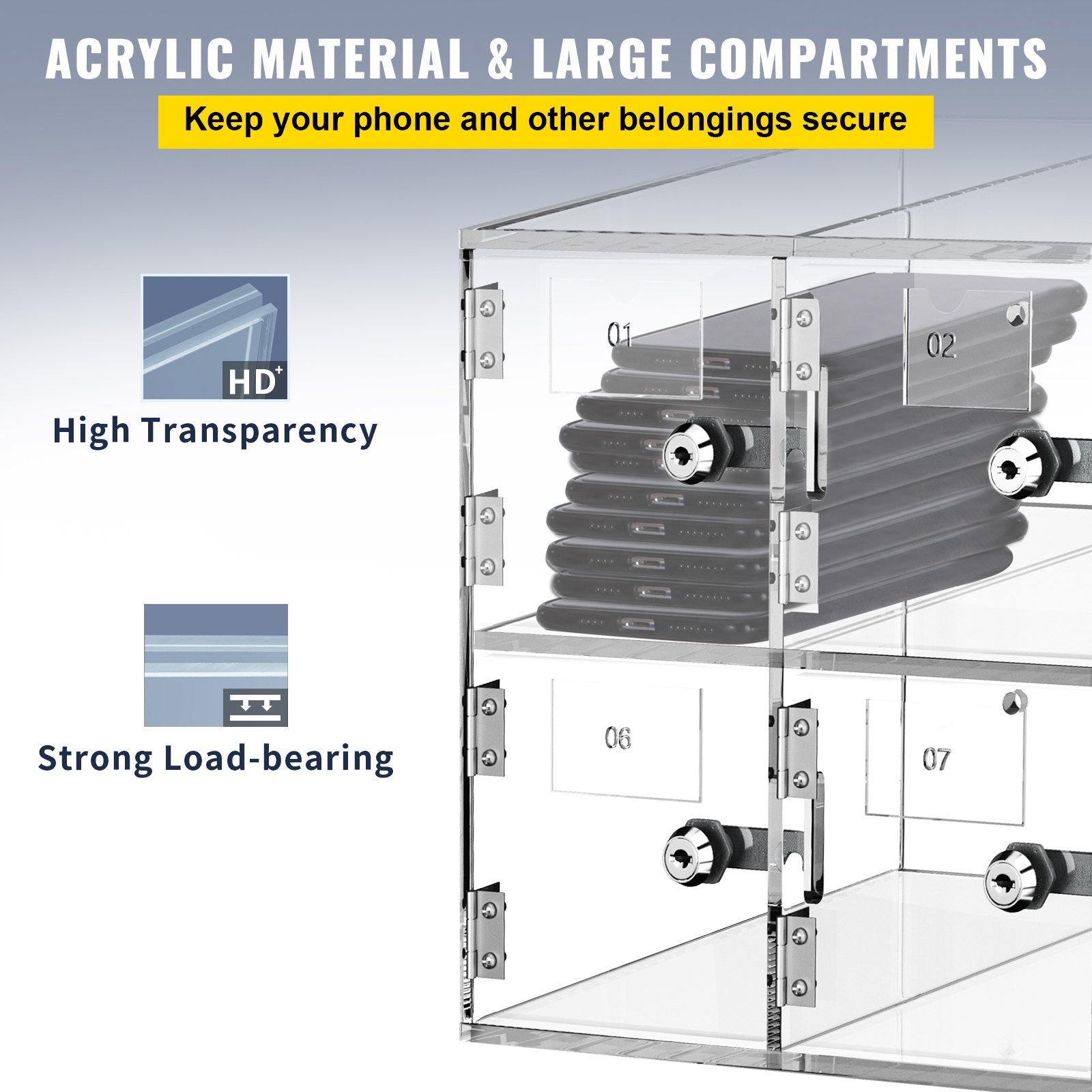 - Clear Acrylic & Large Capacity: Our cell phone locker is made of high-quality acrylic, which is not easy to deform and guarantees a long service life for the cabinet. Each slot measures 3.9" W x 7" D x 3.9" H. The compartment size is suitable for 99% of mobile phones on the market. Securely hold your phones, wallets, and other belongings.